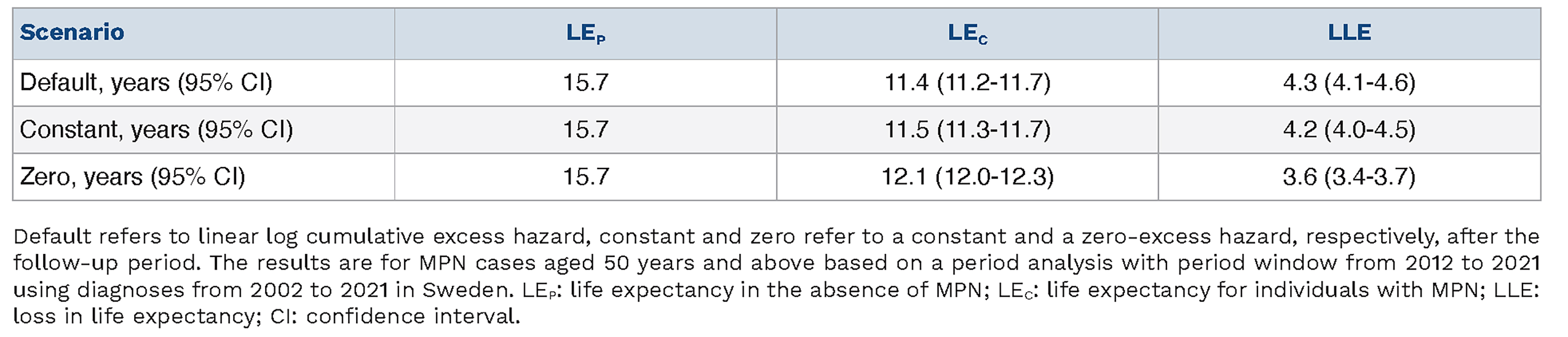 The results showed the impact of assumptions about the behavior of the excess hazard beyond the follow-up period on estimates of LEC and LLE. Extrapolation based on the model parameters (the default scenario) and constant excess hazard beyond the follow-up period yielded similar estimates. Conversely, assuming zero excess hazard beyond the follow-up period resulted in substantial discrepancies to the by default estimates. Notably, the estimated LLE for older patients was similar across all three scenarios, primarily due to the prevailing expected mortality at these ages and the shorter extrapolation length. It is important to note that the estimation of LEC and LLE requires extrapolation beyond the observed data, and the results should be interpreted with this in mind. The default and constant scenarios are simplifications of a more complex reality. However, the fact that they produce almost identical results suggests that their assumptions about the behavior of the excess hazard rate beyond 15-year follow-up are similar. This is also supported by the fact that competing mortality from non-MPN causes tends to dominate over time. It should also be noted that if the excess hazard begins to increase after our chosen follow-up period of 15 years, this increase will not be captured by our modeling approach.