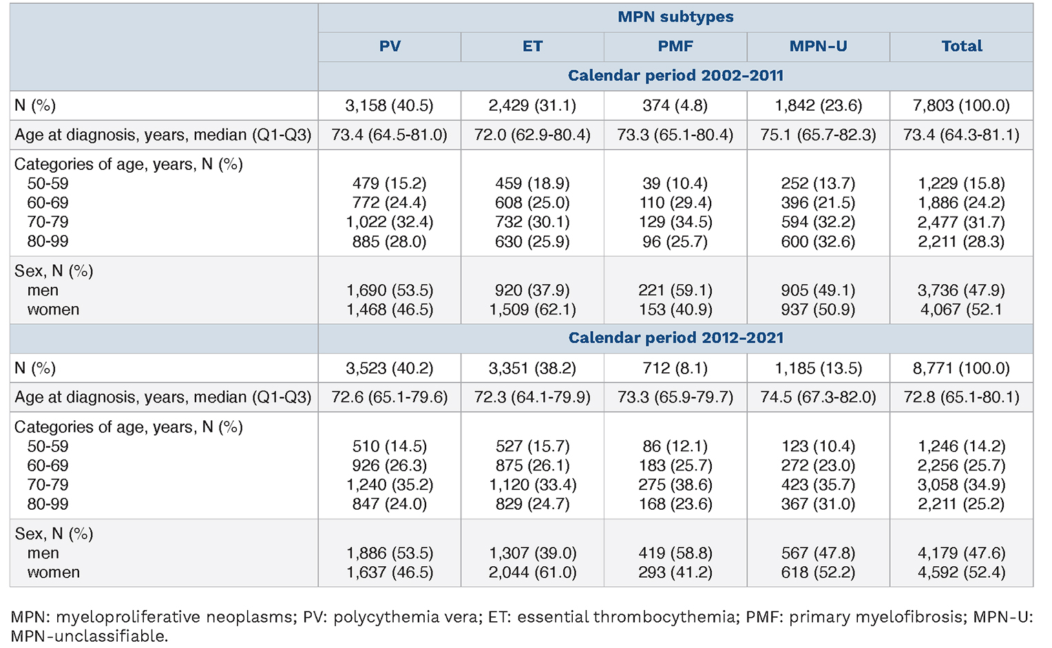 Table 1.Demographic characteristics of patients with myeloproliferative neoplasms (MPN) diagnosed in Sweden during the years from 2002 to 2021 by MPN subtypes: polycythemia vera, essential thrombocythemia, primary myelofibrosis and MPN-unclassifiable.