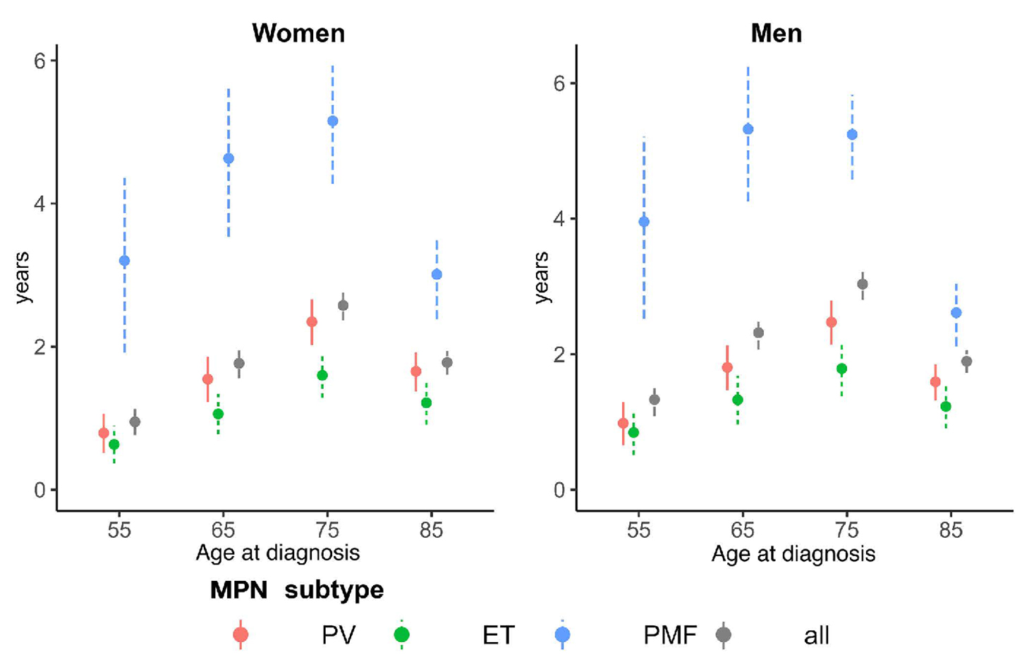 Figure 2.Loss in 15-year restricted mean survival time in myeloproliferative neoplasms, with 95% confidence intervals. Results are shown for women and men aged 55, 65, 75 and 85 years at myeloproliferative neoplasms (MPN) diagnosis based on a period analysis with period window from 2012 to 2021, using diagnoses from 2002 to 2021 in Sweden. Loss in 15-year restricted mean survival time (LRMST) is presented in years. The results are presented by MPN subtypes: polycythemia vera (PV), essential thrombocythemia (ET), and primary myelofibrosis (PMF) as well as for all MPN subtypes combined (including MPN-unclassifiable).