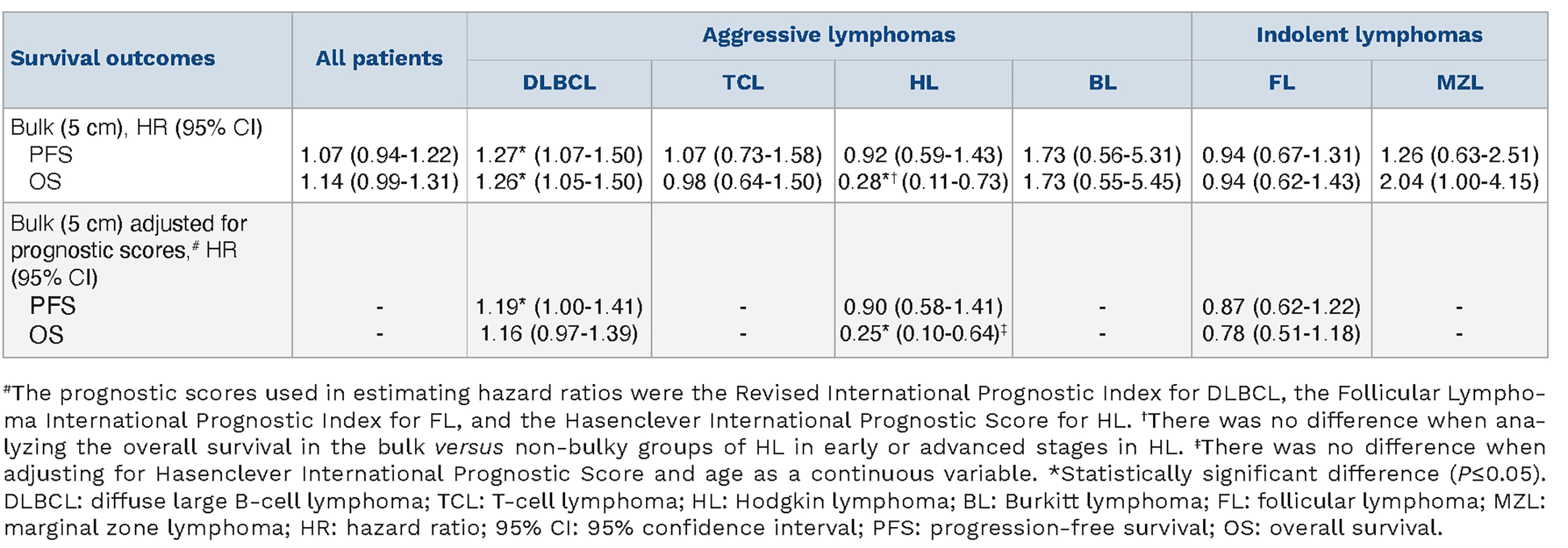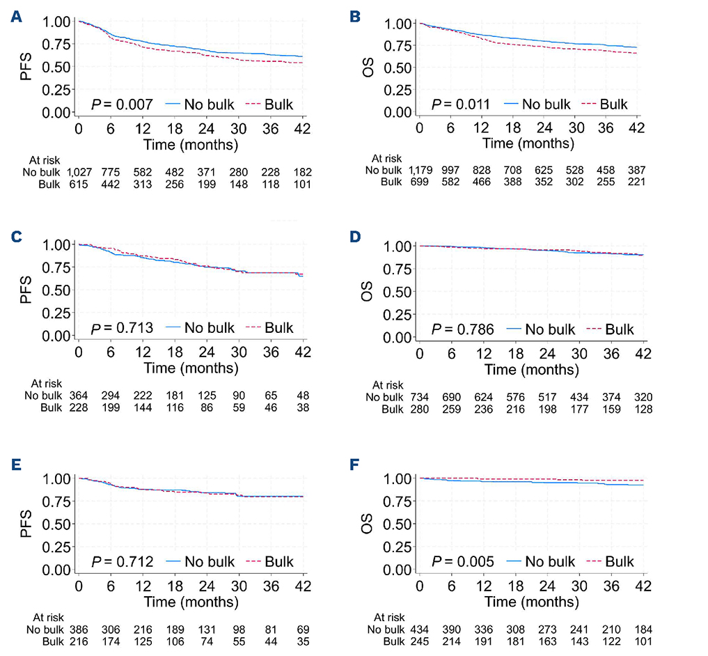 A statistical difference in PFS according to presence of bulk was only found in DLBCL (HR=1.27, 95%CI: 1.07-1.50, P=0.007) (Figure 2A, Table 4, Online Supplementary Figure S1) and not in FL (Figure 2C) or HL (Figure 2E).