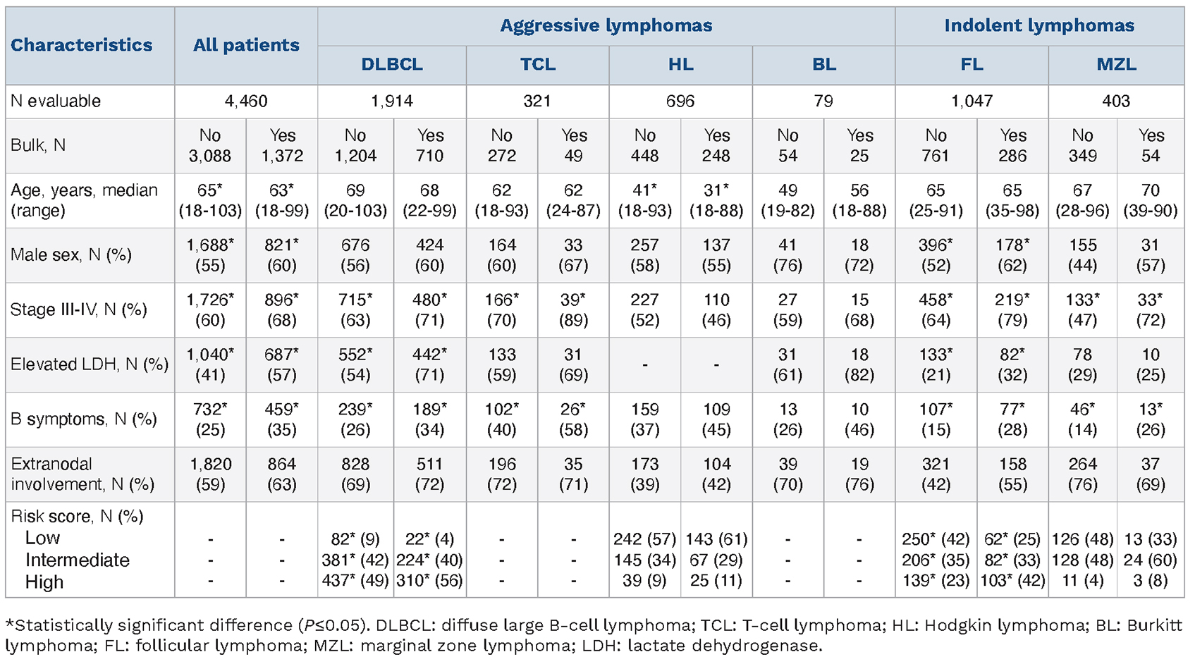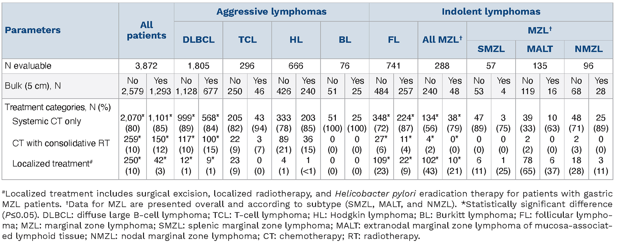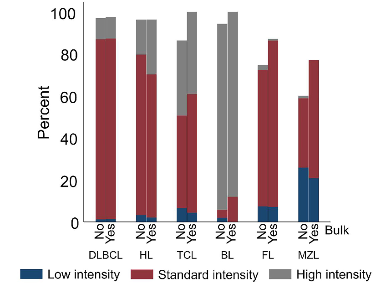 Figure 1.Systemic therapy treatment intensity according to the presence of bulk in each disease subtype. DLBCL: diffuse large B-cell lymphoma; HL: Hodgkin lymphoma; TCL: T-cell lymphoma; BL: Burkitt lymphoma; FL: follicular lymphoma; MZL: marginal zone lymphoma.