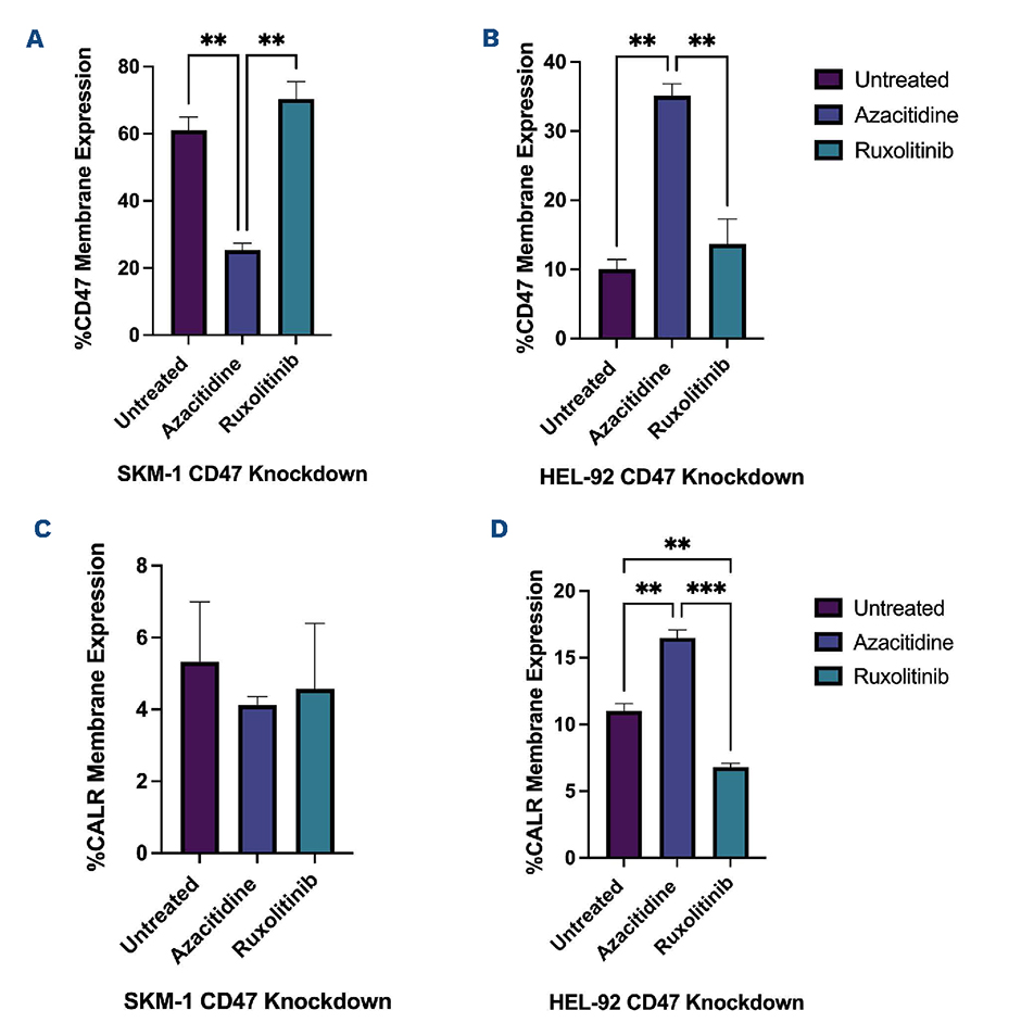 Under physiological conditions, CALR resides within the endoplasmic reticulum and is involved in calcium homeostasis and protein folding. However, in the context of malignant transformation, CALR can translocate to the plasma membrane, where it serves as an immunogenic signal. Interestingly, in many malignancies, including AML and other leukemias, CD47 is overexpressed, effectively overriding the prophagocytic signals and allowing malignant cells to evade immune detection.3,5 The dynamics of CALR and CD47 expression in myeloid neoplasms such as MDS and MPN, however, remain incompletely understood.6,7 To investigate this, we examined CALR and CD47 expression in MDS and MPN using a combination of in vitro models and patient-derived peripheral blood mononuclear cells (PBMC). Cell line models included SKM-1 and MOLM-13 for MDS, and HEL-92 and GDM-1 for MPN. These were treated with disease-relevant therapies: azacytidine (5 μM, 48 hours) for MDS and ruxolitinib (5 μM, 48 hours) for MPN. Drug concentrations were selected based on titration studies, with re-dosing at 24-hour intervals to maintain consistent drug exposure. This study has been approved by a formally constituted review board.