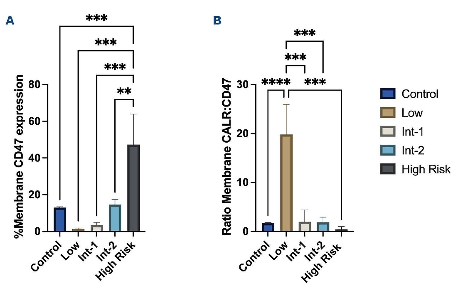Figure 2.Membrane fractionation of CD47 in myelodysplastic syndrome patient samples. Total protein was extracted from patient peripheral blood mononuclear cells (PBMC) samples. Patient samples were subject to fractionation into membrane, cytoplasm, cytosol and nuclear compartments using 2 kits as per manufacturer instructions. The Nucper kit (Thermofisher scientific, UK) was used to separate the sample into cytoplasm and nucleus samples and the Membrane plus kit (Thermofisher scientific, UK), separated the sample into membrane and the cytosol. Expression of CD47 and calreticulin (CALR) was then examined for each cellular fraction via western blotting as detailed in Figure 1. The membrane expression percentages show the level of CD47 in the membrane versus the level of CD47 across all remaining fractions (the cytosol, cytoplasm and nucleus). For our myelodysplastic syndromes (MDS) cohort we had the following Revised International Prognostic Scoring System (IPSS-R) risk-stratified patients: low risk: N=3, intermediate (Int)-1: N=2, Int-2: N=3, high risk: N=2 and healthy controls: N=4. All experiments were done to N=3. The amount of CD47 was normalized to the total protein extracted. (A) Membrane CD47 expression in MDS patient subgroups, significant difference in CD47 levels (P=0.0001), post hoc testing identified significant differences between control and high-risk patients (P=0.0005), low- and high-risk patients (P=0.0002), Int-1 and high-risk patients (P=0.0001) and int-2 and high-risk patients (P=0.0011). (B) Ratio of the membrane fractions of CALR to CD47, significant difference (P<0.0001), post hoc testing identified significant differences between control and low-risk patients (P<0.0001), low and Int-1 patients (P=0.0001), low and Int-2 patients (P=0.0001) and low- and high-risk patients (P=0.0002). Statistical significance was assessed using one-way ANOVA followed by Tukey’s post hoc test. *P<0.05; ** P<0.01; ***P<0.001; ****P<0.0001.