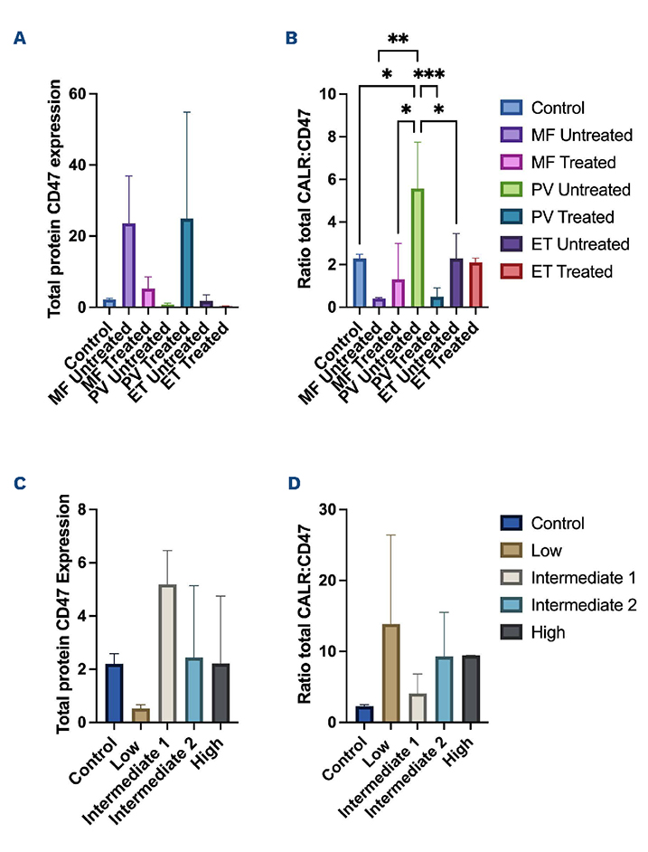 Figure 1.Total CD47 protein expression and ratio of total calreticulin to total CD47 in myelodysplastic syndromes and myeloproliferative neoplasm patient samples. Total protein was extracted from patient peripheral blood mono-nuclear cells (PBMC) samples using the Ficoll-Paque method, with subsequent western blotting with densitometry undertaken using a digital developer (Li-Cor Biosciences, UK) to look at total CD47 and calreticulin (CALR) expression (primary antibodies were obtained from Abcam, UK and secondary antibodies from Li-Cor Biosciences, UK). Protein expression was normalized to housekeeping protein GADPH. All experiments were done to N=3. Myeloproliferative neoplasm (MPN) cohort: myelofibrosis (MF) untreated N=2; MF treated N=2; plycytemia vera (PV) untreated N=4; PV treated N=4; essential thrombocytopenia (ET) untreated N=4; ET treated N=4. Myelodysplastic syndromes (MDS) cohort: Revised International Prognostic Scoring System (IPSS-R) low=3, intermediate (int)-1=2; int-2=3; high=2. (A) No significant difference in total CD47 protein was found across MPN patient subgroups (P=0.1347). (B) Significant difference in the ratio of CALR:CD47 total protein in MPN (P=0.0008), post hoc testing revealed significant differences between healthy control and PV untreated (P=0.0202), MF untreated and PV treated (P=0.0036), MF treated and PV untreated (P=0.0134), PV untreated and PV treated (P= 0.0004), and PV untreated and ET treated (P=0.0202). (C) No significant difference in total CD47 in MDS patient subgroups. (D) No significant difference in ratio of total CALR:CD47 in MDS patient subgroups. Notably there was a large amount of variability between patients even within patient subgroups as highlighted by the large error bars. Statistical significance is shown on the graphs. Statistical significance was assessed using one-way ANOVA followed by Tukey’s post hoc test. *P<0.05; **P<0.01; ***P<0.001.