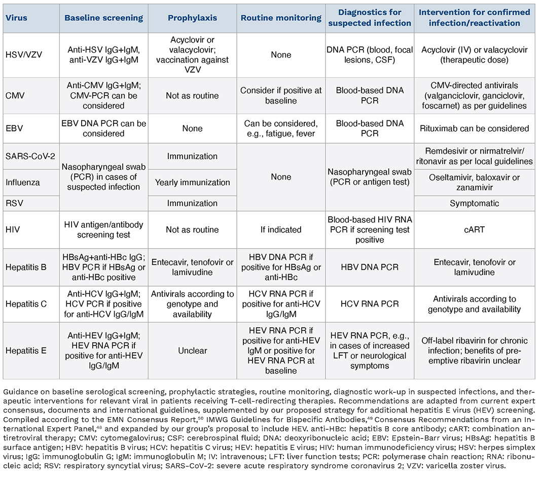 Table 3.Guidance on viral infection management in T-cell-redirecting therapy.
