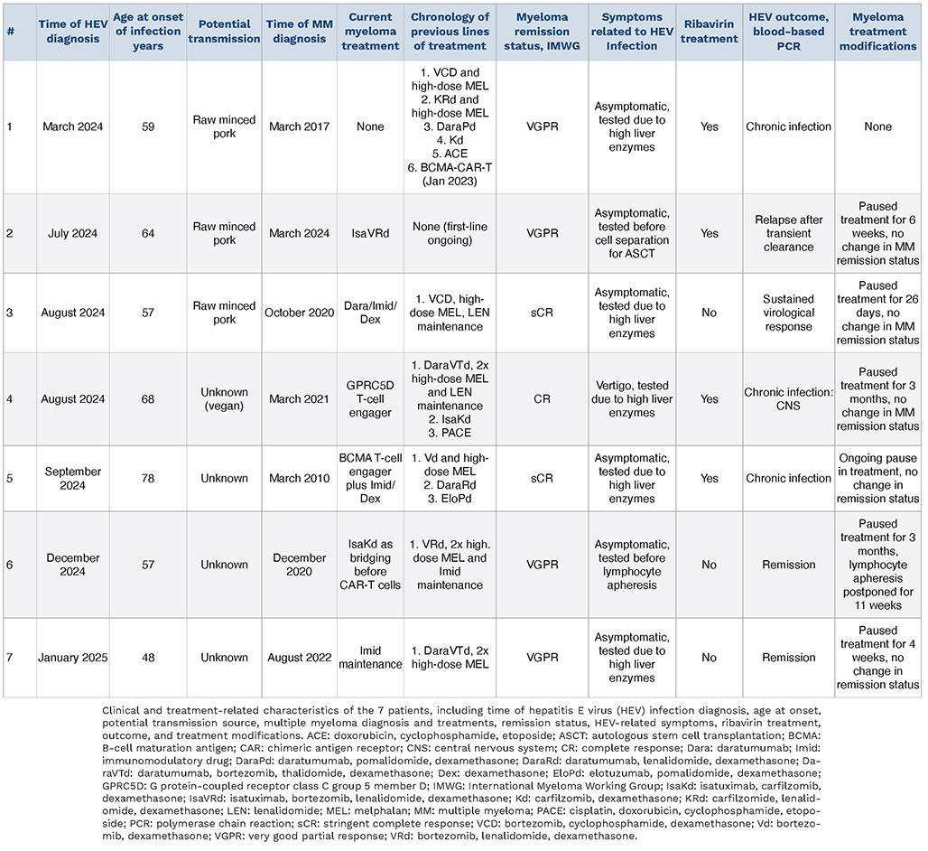 This is a retrospective analysis of 7 patients (5 males, 2 females) aged 48 to 78 years, who were diagnosed with HEV infections between March 2024 and January 2025. All patients were identified through positive HEV RNA PCR results from blood samples obtained at the university outpatient clinic of a tertiary center (University Medical Center Hamburg-Eppendorf, Hamburg, Germany), where approximately 300 MM patients are treated on an outpatient basis annually.