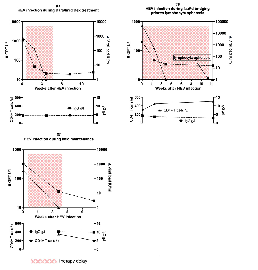 Figure 2.Clinical course and laboratory parameters of hepatitis E virus infection in 3 multiple myeloma patients (cases #3, #6, #7) not treated with ribavirin. Glutamate-pyruvate transaminase (GPT) levels (black squares) and hepatitis E virus (HEV) viral load (black triangles) are shown in relation to therapy delays (pink shaded area). Lower panels depict CD4+ T-cell counts and immunoglobulin G serum levels over time. Dara: daratumumab; Dex: dexamethasone; GPT: glutamate-pyruvate transaminase; HEV: hepatitis E virus; IgG: immunoglobulin G; Imid, immunomodulatory drug; IsaKd: isatuximab, carfilzomib, dexamethasone.