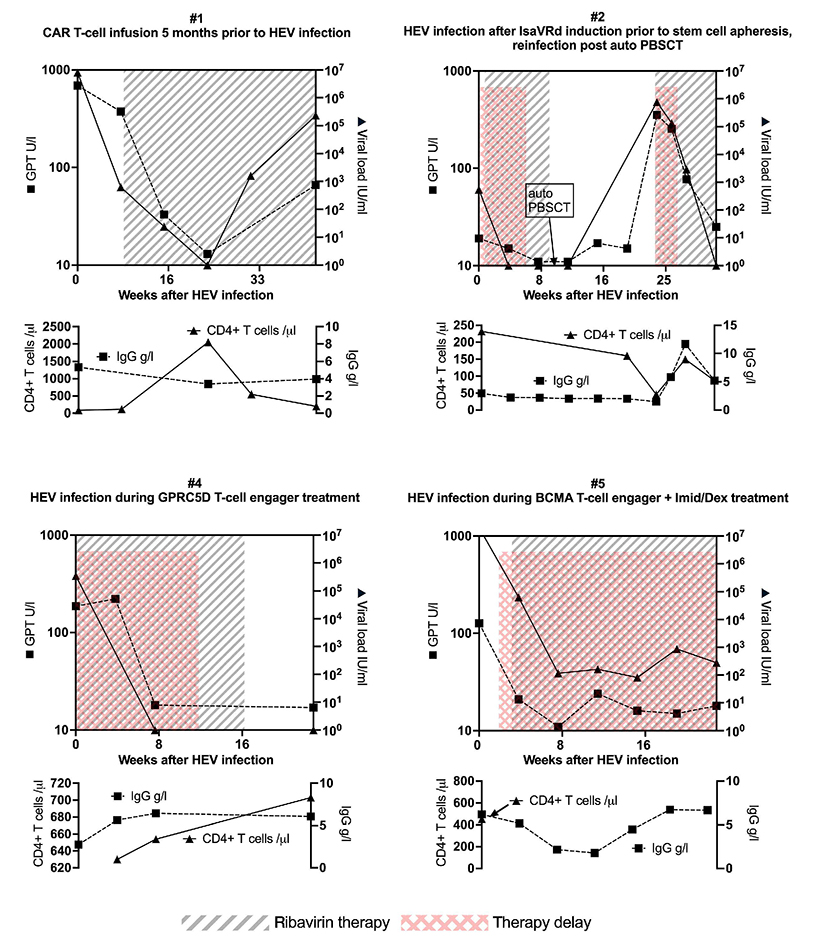Figure 1.Clinical course and laboratory parameters of hepatitis E virus infection in 4 multiple myeloma patients (cases #1, #2, #4, #5) treated with ribavirin. Glutamate-pyruvate transaminase (GPT) levels (black squares) and hepatitis E virus (HEV) viral load (black triangles) are shown in relation to ribavirin treatment (gray shaded area) and therapy delays (pink shaded area). Lower panels depict CD4+ T-cell counts and immunoglobulin G serum levels over time. autoPBSCT: autologous peripheral blood stem cell transplantation; BCMA: B-cell maturation antigen; CAR: chimeric antigen receptor; Dex: dexamethasone; GPRC5D: G protein-coupled receptor class C group 5 member D; GPT: glutamate-pyruvate transaminase; IgG: immunoglobulin G; Imid: immunomodulatory drug.
