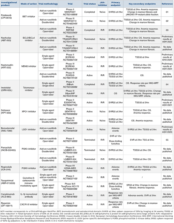 Table 2.Ongoing phase II and phase III trials with new investigational therapies in myelofibrosis.