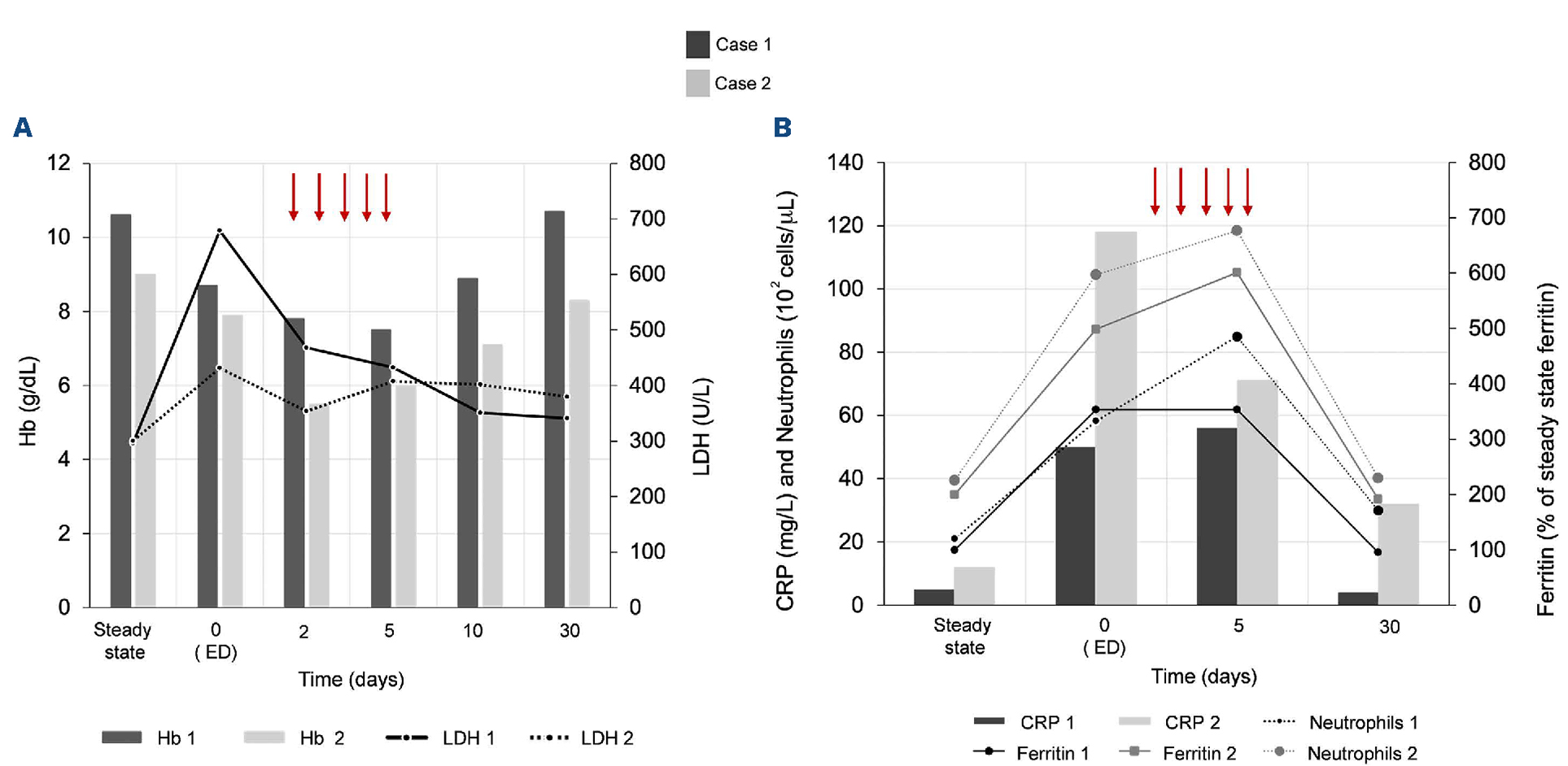 Figure 1.Graphical representation of the two cases of Jehovah’s Witnesses with sickle cell disease and acute chest syndrome. (A) Hemoglobin and lactate dehydrogenase at the patients’ admission to the Emergency Department (time 0), during hospitalization and at 30 days after hospital discharge. (B) Markers of systemic inflammation, C-reactive protein, neutrophils and ferritin. The red arrows indicate the days of immunoglobulin intravenous administration. Immunoglobulins were administered at the dosage of 400 mg/kg/day for 5 days. Hb: hemoglobin; ED: Emergency Department; LDH: lactate dehydrogenase; CRP: C-reactive protein.
