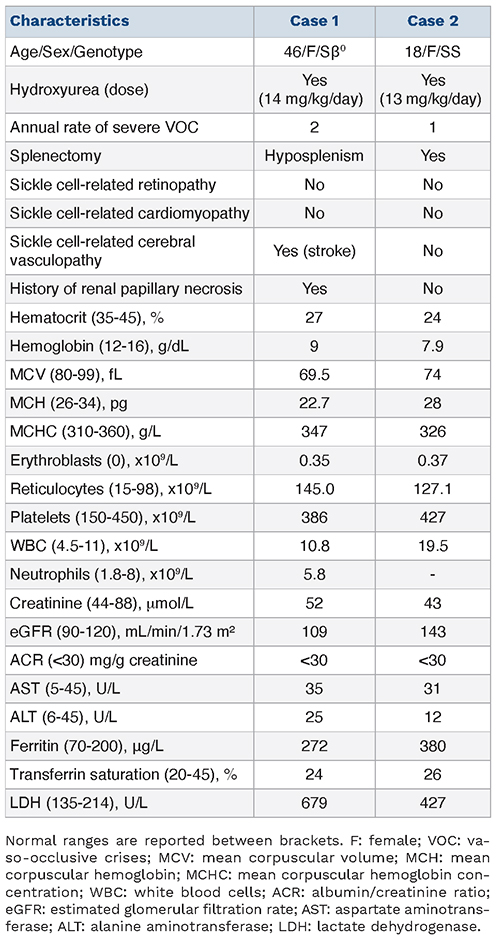 Here, we report the cases of two Jehovah’s Witnesses with SCD admitted to our department for acute chest syndrome (ACS). This study was conducted in accordance with the Declaration of Helsinki, under ethical committee approval (FGFRITA13). The patients’ characteristics and biochemistry findings are shown in Table 1.