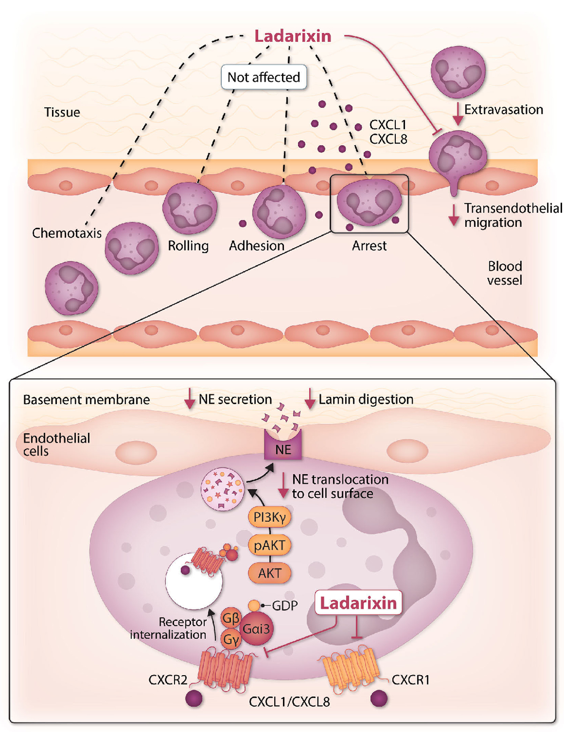 Neutrophil trafficking into inflamed tissues is modeled as a tightly orchestrated multistep process that has been detailed in excellent reviews.3 Among key receptors in the adhesion cascade are CXCR1 and CXCR2 expressed on neutrophils. CXCR1 and CXCR2 bind CXCL8 (in humans) and CXCL1 (in mice), which play pivotal roles in regulating neutrophil arrest on the activated endothelium and directional movement toward the inflammatory locus.4 Consistently, deletion of the CXCR2 gene or the dual CXCR1 and CXCR2 non-competitive allosteric inhibitor ladarixin were reported to attenuate the inflammatory response and reduce neutrophil tissue damage and disease progression in various preclinical models, including ischemia-reperfusion, type 1 diabetes and airway inflammation.5 Aligning with CXCL1 and CXCL8-triggered neutrophil penetration of vascular basement membrane, Napoli et al. identify a novel mechanism, inhibition of CXCR1/CXCR2-induced mobilization of neutrophil elastase to the cell surface and release during migration, by which ladarixin can impair neutrophil trafficking into inflamed tissue. Importantly, ladarixin showed similar efficiencies in both murine and human primary neutrophils, underscoring the translational potential of the observations. Neutrophil degradation of laminin is a prerequisite for penetrating the vascular basement membrane. Hence, the findings with ladarixin lend further support to the notion that reducing neutrophil basement membrane penetration and laminin degradation is sufficient to attenuate neutrophil extravasation without interfering with the transition from neutrophil rolling to firm adhesion to endothelial cells6 or internalization of CXCR2.