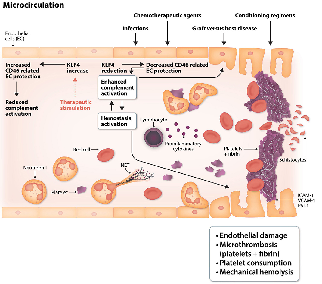 Despite these potential limitations, the authors found increased levels of markers of complement activation and of endothelial injury in plasma of their TA-TMA patients. In contrast, they documented reduced plasma levels of circulating KLF4. Incubating cultures of human umbilical vein endothelial cells (HUVEC) with plasma of TA-TMA patients, pro-inflammatory and prothrombotic endothelial markers as well as the cell deposition of activated complement components were studied in adherent (intact) HUVEC and detached endothelial cells (a surrogate for circulating endothelial cells). KLF4 transcripts and protein were markedly downregulated in detached endothelial cells as compared to intact HUVEC, suggesting that diminished KLF4 expression compromised endothelial resistance. Treatment of HUVEC with the KLF4 stimulator APTO253 as well as the lentiviral vector-mediated overexpression of KLF4 restored these alterations. To clarify the mechanisms of KLF4-mediated endothelial protection the authors used an enzyme-tethering strategy that provides efficient high-resolution sequencing libraries for profiling diverse chromatin components, i.e., CUT&Tag (cleavage under targets and tagmentation).10 Using CUT&Tag, RNA sequencing, transfection and luciferase assays, Jiang et al. concluded that KLF4 upregulates CD46 expression in HUVEC.1 Finally, they used an animal model of dimethyloxalylglycine (DMOG)-treated mice; such mice show a phenotype resembling that seen in TA-TMA patients. Treatment with the KLF4 stimulator APTO253 reduced hemolysis, increased platelet number and reduced markers of endothelial damage. APTO253 also improved kidney lesions, as shown by histological analysis, and decreased C3/C5b-9 deposition, as shown by immunofluorescence. Quantitative real-time polymerase chain reaction and western blot analyses confirmed KLF4 overexpression in renal tissues. Using the same methodology a similar improvement was observed in mice treated with pravastatin, which was administered via oral tube at the dosage of 20 mg/kg daily. If the data of Jiang et al.1 are confirmed, the KLF4-CD46 axis may have an important place in the pathophysiology of TA-TMA (Figure 1). Indeed, endothelial injury and complement activation are considered the central aspects of TA-TMA pathophysiology.2 Several factors in the transplantation process, such as chemotherapeutic agents, conditioning regimens, infections, and graft-versus-host disease, lead to endothelial injury and to an increase in pro-inflammatory cytokines, prothrombotic factors and complement activation, which in turn further damage the endothelium. Patients with variants of complement system regulatory proteins predisposing to complement hyperactivation, also acquired from their hematopoietic stem cell donors, appear to be at increased risk of TATMA.11,12 Neutrophil extracellular traps may also link endothelial injury and complement activation.13 The reduced plasma levels of KLF4 leading to low expression of CD46 render the endothelium more vulnerable to complement activation in TA-TMA. The possibility of pharmacologically increasing KLF4 levels with a subsequent increase of endothelial CD46 will protect against complement hyperactivation and TMA.