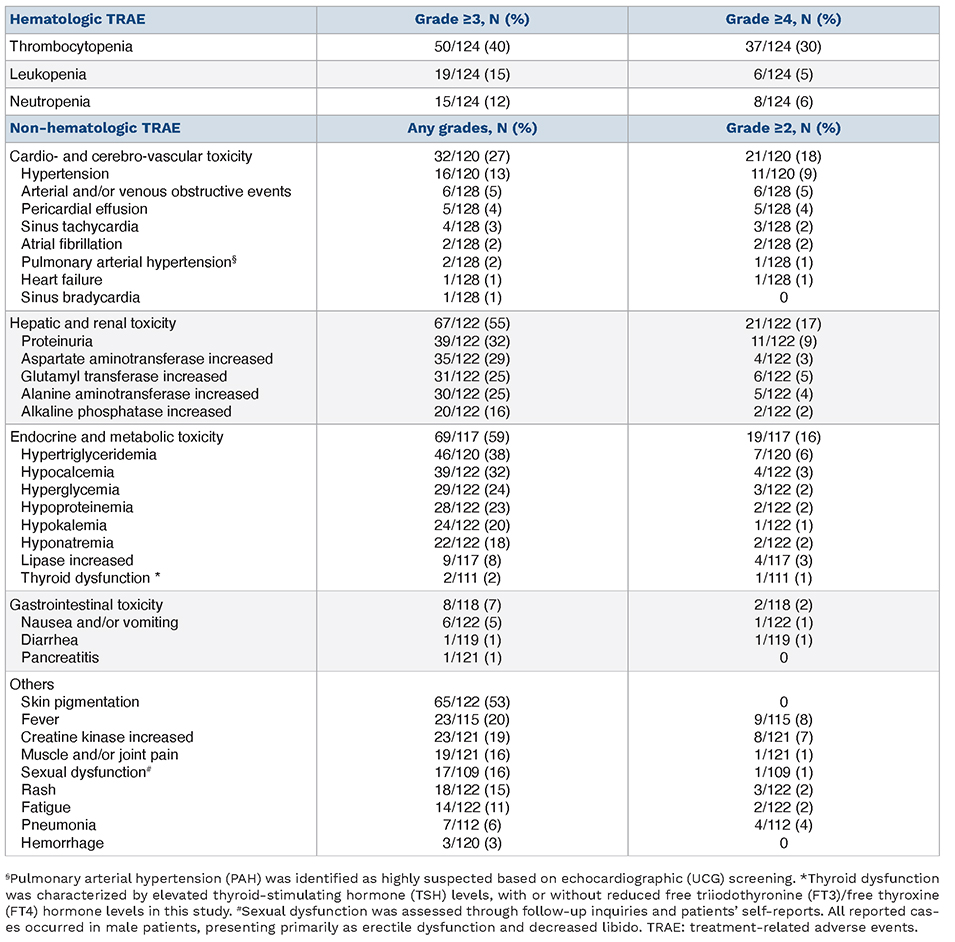 Fifty-two (42%) subjects developed a grade ≥3 hematological TRAE including thrombocytopenia (N=50, 40%), leukopenia (N=19, 15%) and neutropenia (N=15, 12%; Table 4). The most frequent non-hematologic (any grade) TRAE was skin hyperpigmentation (N=65, 53%), followed by hypertriglyceridemia (N=46, 38%), proteinuria and hypocalcemia (N=39, 32% each; Table 4). CVE were observed in 32 (27%) subjects including hypertension (N=16), arterial and/ or venous thromboses (N=6), pericardial effusion (N=5), sinus tachycardia (N=4), atrial fibrillation and pulmonary arterial hypertension (N=2 each), congestive heart failure and sinus bradycardia (N=1 each).