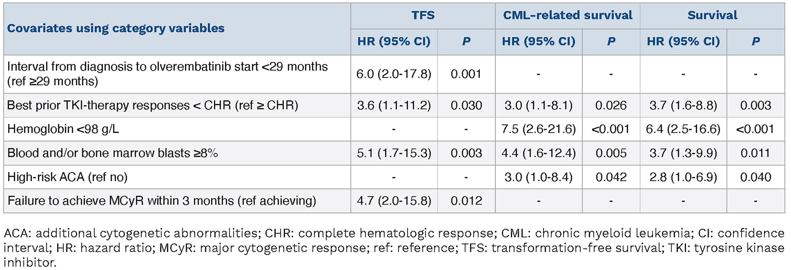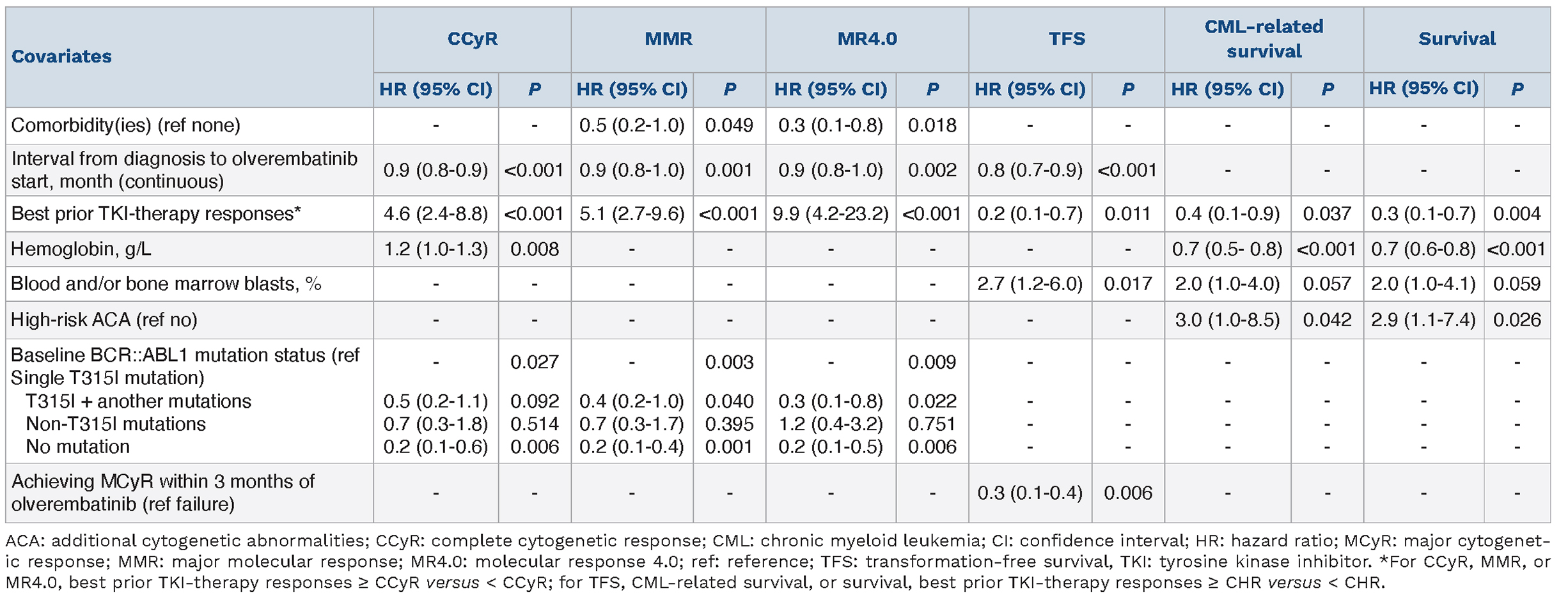 Results of univariable analyses are displayed in Online Supplementary Table S2. There were no interactions between covariates. In multivariable analyses comorbidity (P=0.018-0.049), a longer interval from diagnosis of CML to olverembatinib therapy (P<0.001-0.002), best therapy response on prior TKI therapy <CCyR (P<0.001), lower hemoglobin concentration at the start of olverembatinib (P=0.008), and harboring other ABL1 mutations or no ABL1 mutation by Sanger sequencing (vs. a single T315I mutation; P=0.003-0.027) were significantly associated with lower cumulative incidences of CCyR, MMR and/or MR4.0 (Table 2; Online Supplementary Figure S2). Additionally, a briefer interval from diagnosis of CML to olverembatinib therapy (P<0.001), best therapy response on prior TKI therapy <CHR (P=0.004-0.037), lower hemoglobin concentration (P<0.001), higher blood or bone marrow blasts (P=0.017), high-risk ACA (P=0.026-0.042) at start of olverembatinib, and no MCyR at 3 months after olverembatinib start (P=0.006) were significantly associated with worse TFS, CML-related survival and/or survival (Table 2). There were no statistically significant differences in treatment response and outcomes between subjects in the accelerated phase and those in second chronic phase but not in MaHR with a history of accelerated phase at the olverembatinib start.