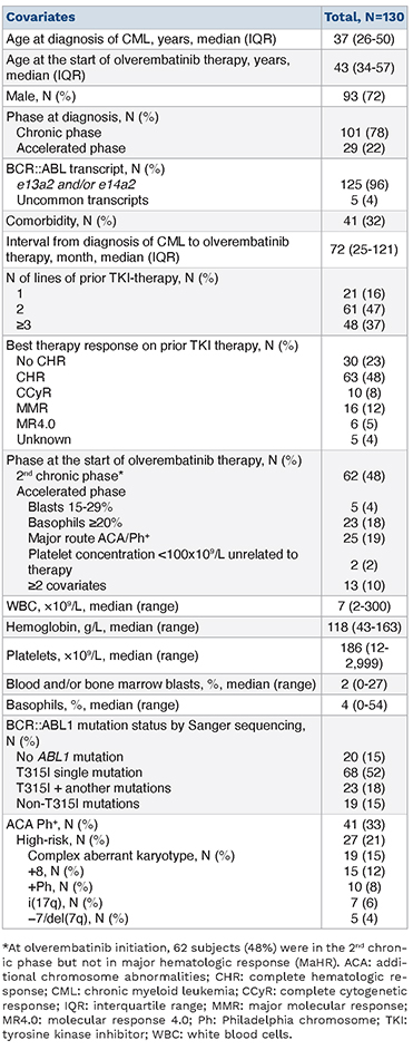 People with accelerated-phase chronic myeloid leukemia (CML), de novo or after transformation from chronic phase have a poorer prognosis than those with chronic phase CML, especially if previously treated with a second-or third-generation tyrosine kinase inhibitors (2G- or 3G-TKI).1 -7 Olverembatinib (HQP-1351) is a novel 3G-TKI that acts as an adenosine triphosphate (ATP)-binding site inhibitor targeting both wild-type BCR:ABL1 kinase and a broad spectrum of BCR::ABL1 mutants including T315I.8,9 Olverembatinib’s BCR:ABL1 inhibitory activity underlies its clinical utility for CML treatment,10,11 and its safety and efficacy have been shown in people with extensively treated chronic-phase and accelerated-phase CML.12,13 However, there are few recent large studies on therapy of accelerated-phase CML, especially in people failing prior TKI therapy. Therefore, we interrogated data from 130 consecutive subjects with accelerated-phase CML failing prior TKI-therapy and/or with BCR::ABL1T315I receiving olverembatinib. We evaluated efficacy and safety and studied covariates correlated with outcomes.