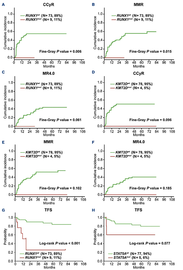 Figure 4.Impact of variants on subsequent cytogenetic and molecular response, and transformation-free survival. (A-C) RUNX1 variant on cumulative incidence of complete cytogenetic response (CCyR), major molecular response (MMR) and molecular response 4.0 (MR4.0). (D-F) KMT2D variant on cumulative incidence of CCyR, MMR and MR4.0. (G-H) RUNX1 and STAT5A variant on probability of transformation-free survival (TFS).