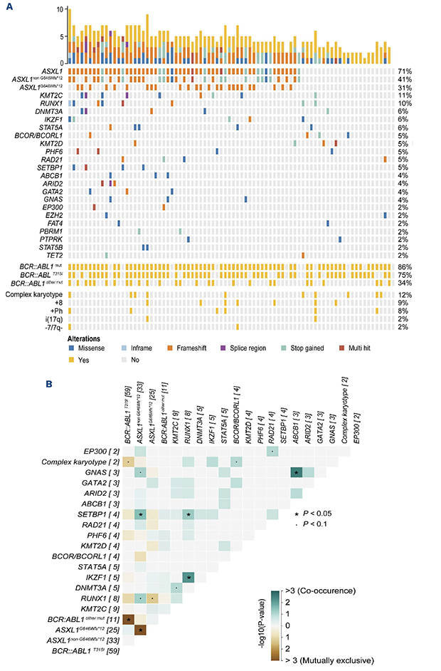 In pairwise analyses of genomics and/or cytogenetics, there was a significant co-occurrence of ASXL1non-G646Wfs*12 and SETBP1 variants (N=4; P=0.030), RUNX1 and IKZF1 variants (N=3; P=0.008) and ABCB1 and GNAS variants (N=2; P=0.003; Figure 3B).
