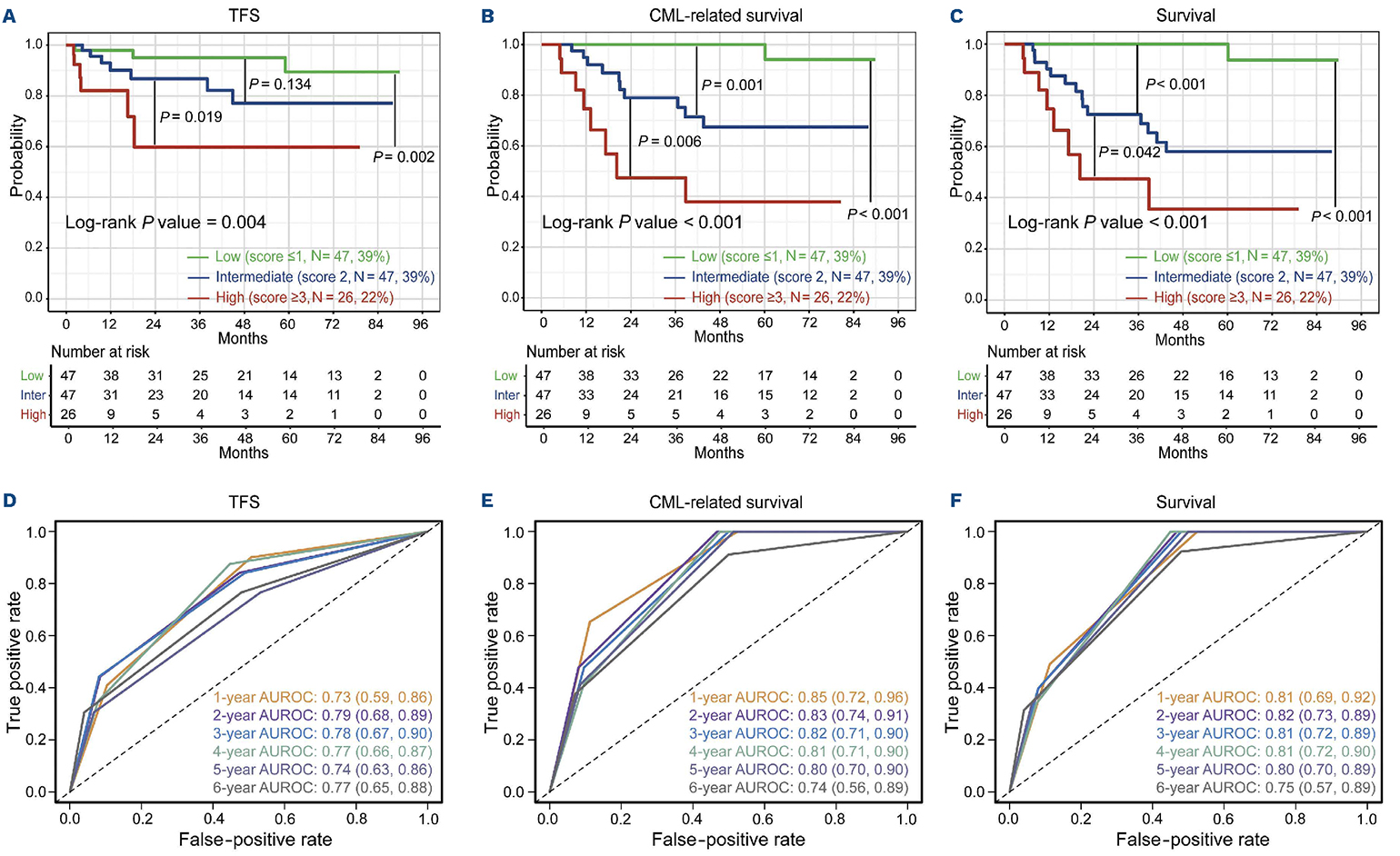 Figure 2.Prognostic value of the risk group by the number of adverse prognostic covariates. (A-C) Kaplan-Meier curves of transformation-free survival (TFS), chronic myeloid luekemia (CML)-related survival, and survival. (D-F) ROC curves of the risk group for 1-, 2-, 3-, 4-, 5- and 6-year probabilities of TFS, CML-related survival, and survival.