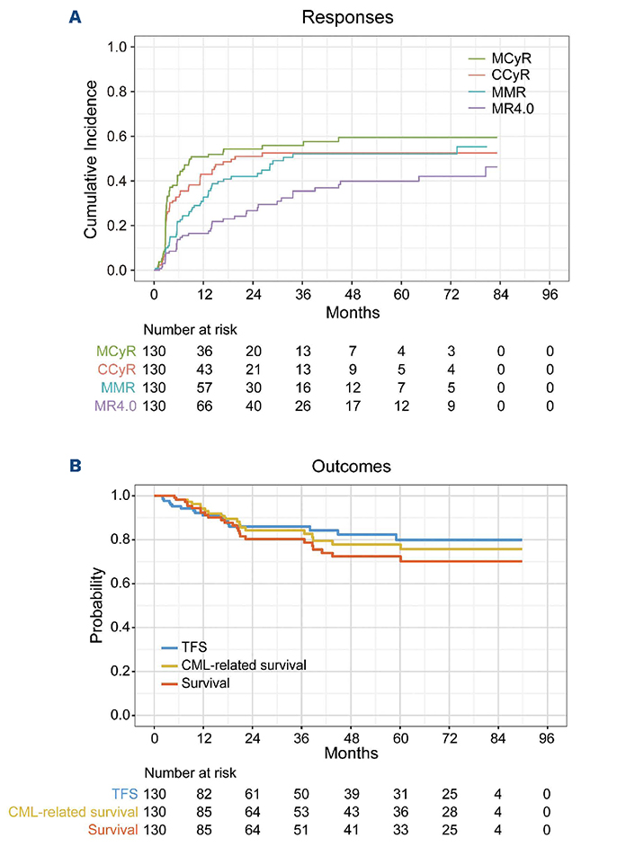 Figure 1.Responses and outcomes. (A) Responses. (B) Outcomes. MCyR: major cytogenetic response; CCyR: complete cytogenetic response; MMR: major molecular response; MR4.0: molecular response 4.0; TFS: transformation-free survival.