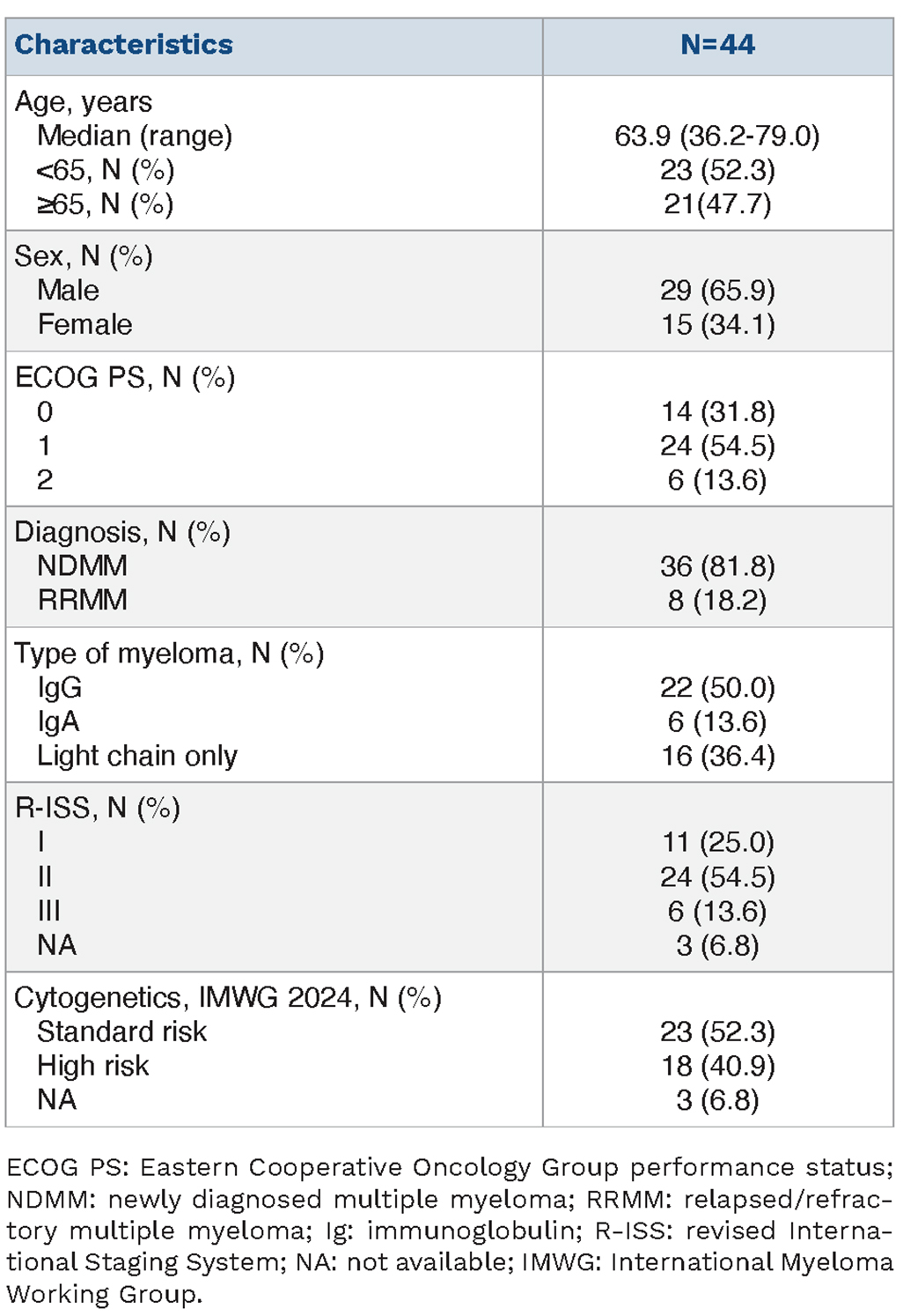 We retrospectively evaluated 44 patients (36 newly diagnosed; 8 relapsed/refractory) who received ixazomib maintenance after ASCT between May 2018 and June 2024 (Table 1). The study was conducted in accordance with the Declaration of Helsinki and was approved by the Technical University of Munich ethics committee (code: 2025-307-S-CB). AE, including neuropathy, were abstracted from medical records and graded per Common Terminology Criteria for Adverse Events (CTCAE) as documented during routine care. The median follow-up time for the cohort was 26.2 months (range, 7-81 months). High-risk cytogenetics, defined according to International Myeloma Working Group (IMWG) 2024 criteria, were identified in 40.9% of the cohort.9 All patients received standard induction therapy and all but one underwent ASCT prior to ixazomib. The most used induction regimen was bortezomib, cyclophosphamide, and dexamethasone (VCd), administered to 56.8% of patients (Online Supplementary Table S1), while quadruplet combinations including CD38 antibodies like daratumumab were less frequent (20.5%). A significant proportion of patients switched from lenalidomide to ixazomib maintenance (38.6%).