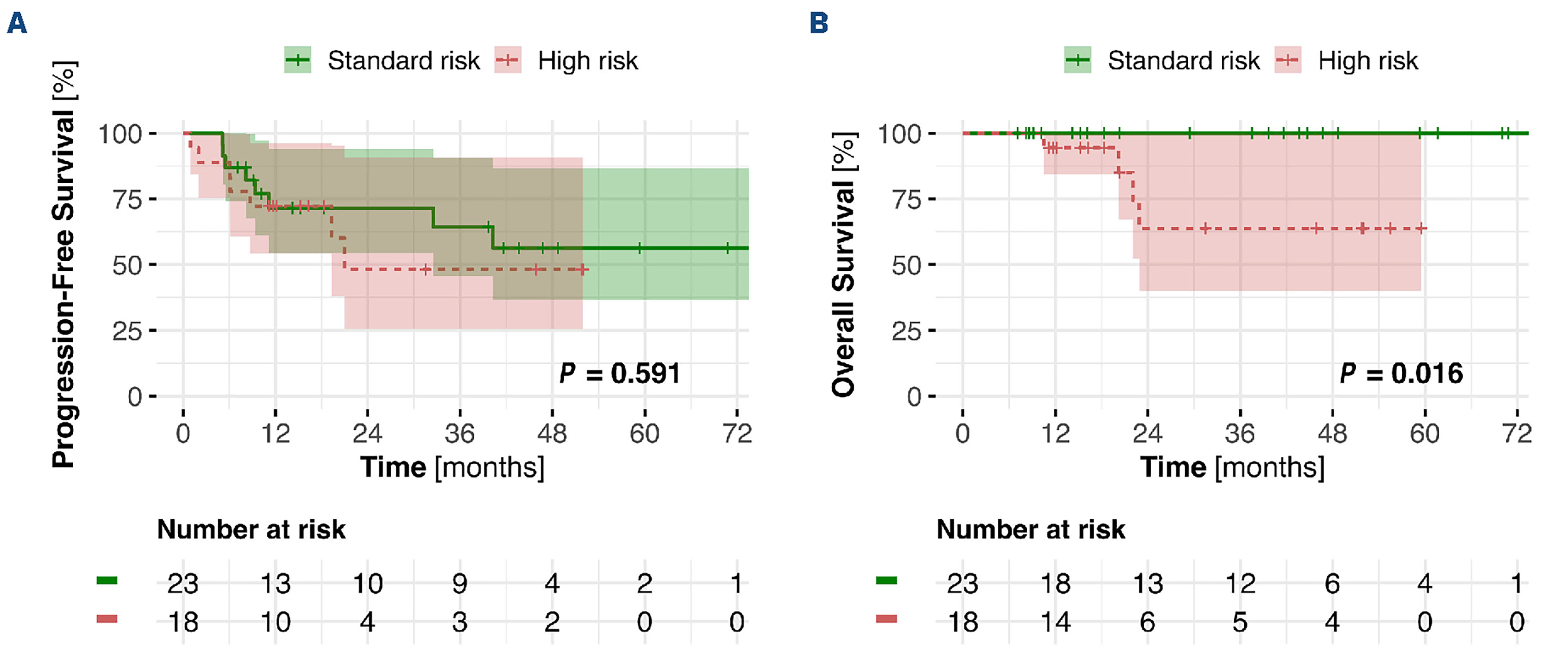 Figure 2.Kaplan-Meier estimates of survival outcomes. (A) Progression-free survival and (B) overall survival stratified by baseline risk status according to International Myeloma Working Group 2024 (standard risk, N=23; high risk, N=18). Three patients with unknown risk status are excluded. Shaded areas indicate 95% confidence intervals. Vertical ticks represent censored observations. P values comparing risk groups (log-rank test) are shown.