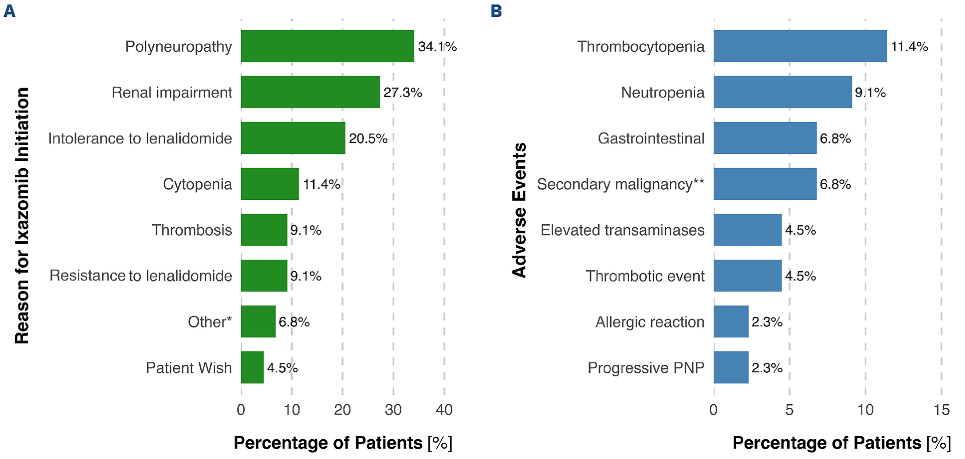 Figure 1.Reasons for ixazomib initiation and adverse event profile. (A) Primary reasons for initiating ixazomib maintenance therapy. (B) Frequency of common adverse events observed during ixazomib maintenance. Data represent the percentage of patients (N=44) in each category; multiple entries were allowed per patient. *One patient with psoriatic arthritis, 1 patient with cardiac involvement of amyloidosis, 1 not specified. **Without definite causal link to ixazomib (1 patient with acute myeloid leukemia and 2 patients with myelodysplastic syndrome).