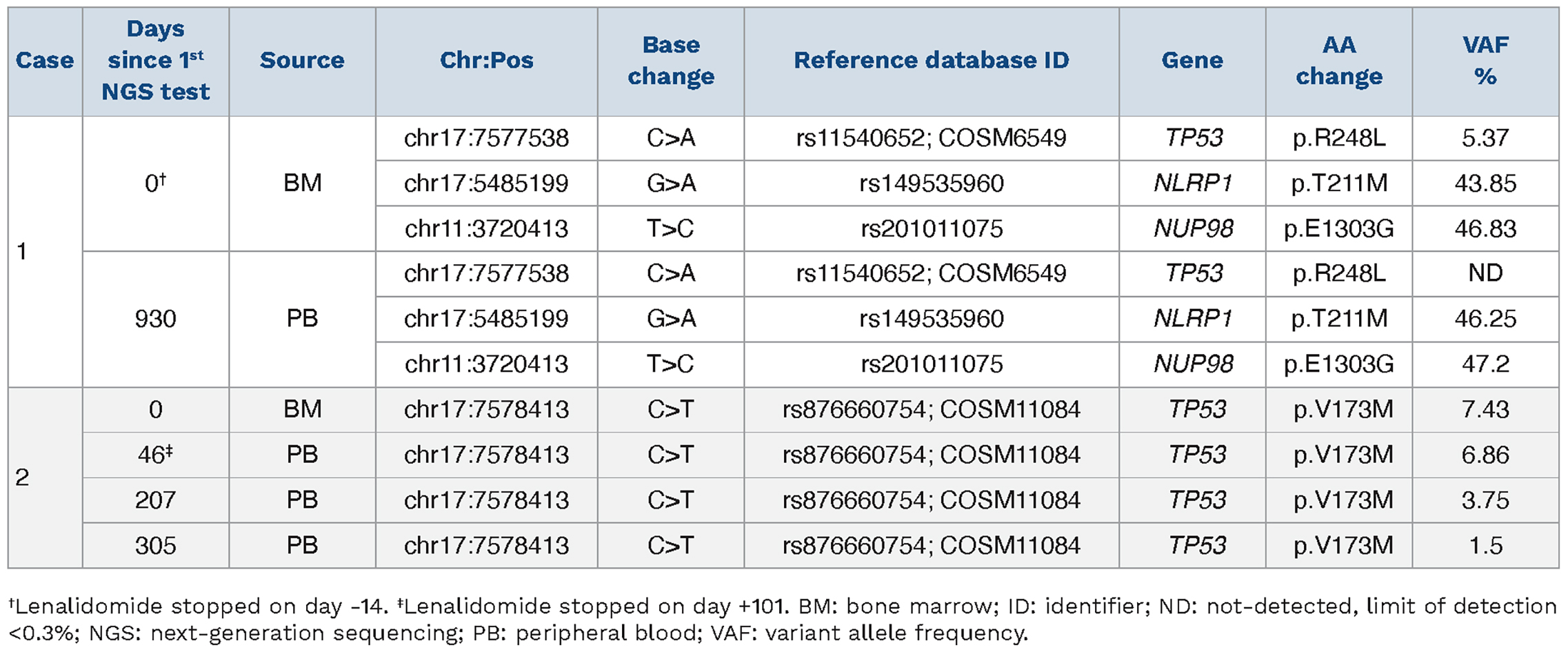 Case 1: a 63-year-old previously healthy Caucasian female presented with nephrotic syndrome, monoclonal gammopathy, and a normal complete blood count (CBC). A subsequent kidney biopsy demonstrated renal AL amyloidosis. Bone marrow (BM) examination revealed approximately 20% clonal plasma cells without significant myeloid or erythroid dysplasia. Computed tomography revealed multiple lytic bone lesions consistent with a concomitant diagnosis of multiple myeloma (MM). The patient underwent six cycles of lenalidomide, bortezomib, and dexamethasone followed by lenalidomide maintenance for approximately four months at which time she developed pancytopenia (hemoglobin [Hgb] 7.1 g/dL, absolute neutrophils 570/mm3, platelets 15,000/ mm3), prompting lenalidomide discontinuation. Repeat BM examination revealed a normocellular marrow with all hematopoietic elements identified with no morphologic evidence of residual myeloma, dysplasia, or increased blasts, and a normal metaphase karyotype. Next-generation sequencing (NGS) on unsorted whole BM aspirate using a custom pipeline covering SNV and indels in 87 genes at a depth average of >1000X after PCR duplicate removal uncovered a pathogenic somatic TP53 R248L mutation at a variant allele frequency (VAF) of 5.37% (see Table 1; only variants are reported). The patient subsequently remained off all anti-MM therapy for two years, with normalization of peripheral blood counts. NGS of peripheral blood (PB) failed to detect the previously identified TP53 mutation (limit of detection ~0.3% VAF). Recent data demonstrate a strong correlation between CHIP clone size in peripheral blood mononuclear cells (PBMC) and CD138-depleted BM in MM patients.8 Therefore, even without matched BM samples, PB provides an appropriate surrogate for overall CHIP clone dynamics and likely indicates a true decrease in the patient’s overall clonal burden.