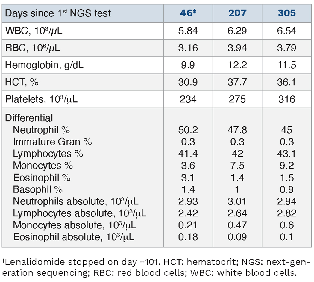 Furthermore, lenalidomide exposure resulted in a selective pressure on normal hematopoietic stem cells that allowed for expansion of TP53-mutant clones.7 However, it remains unclear if cessation of lenalidomide will halt or even reverse the selective expansion of TP53 clonal hematopoiesis (CH). Here we describe 2 patients with plasma cell neoplasm who were treated with lenalidomide, developed cytopenias, and were found to have TP53 CH that subsequently decreased or resolved after cessation of lenalidomide. The presentation of these cases and data within were approved by the Johns Hopkins Institutional Review Board.