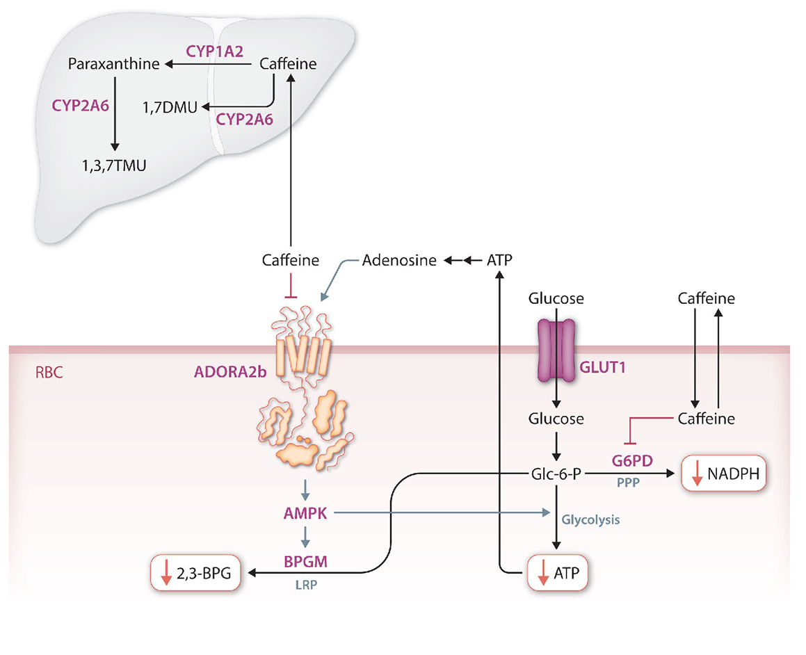 Figure 1.Red blood cell metabolic pathways affected by caffeine exposure. Schematic diagram indicating that caffeine is both a competitive inhibitor of adenosine binding to the ADORA2b adenosine receptor, which downregulates subsequent downstream signaling through AMP-activated protein kinase, and a direct inhibitor of glucose-6-phosphate dehydrogenase, the rate-limiting enzyme in the pentose phosphate pathway. Taken together, this demonstrates that caffeine negatively affects the three major red blood cell pathways that utilize glucose (i.e., glycolysis, the Luebering-Rapoport pathway, and the pentose phosphate pathway), thereby inhibiting their synthetic capacities (downward facing red arrows) to generate energy (i.e., ATP), enhance oxygen offloading by hemoglobin (i.e., 2,3-BPG); and resist storage-induced oxidative stress (i.e., NADPH); respectively. ADORA2b: an adenosine receptor; AMPK: AMP-activated protein kinase; ATP: adenosine triphosphate; BPGM: biphosphoglycerate mutase; 1,7DMU: 1,7-dimethyluric acid; 1,3,7TMU: 1,3,7-trimethyluric acid; CYP1A2 and CYP2A6: two cytochrome p450 isoforms; LRP: Luebering-Rapoport pathway; GLUT1: glucose transporter 1; Glc-6-P: glucose-6-phosphate; G6PD: glucose-6-phosphate dehydrogenase; PPP: pentose phosphate pathway; RBC: red blood cell.