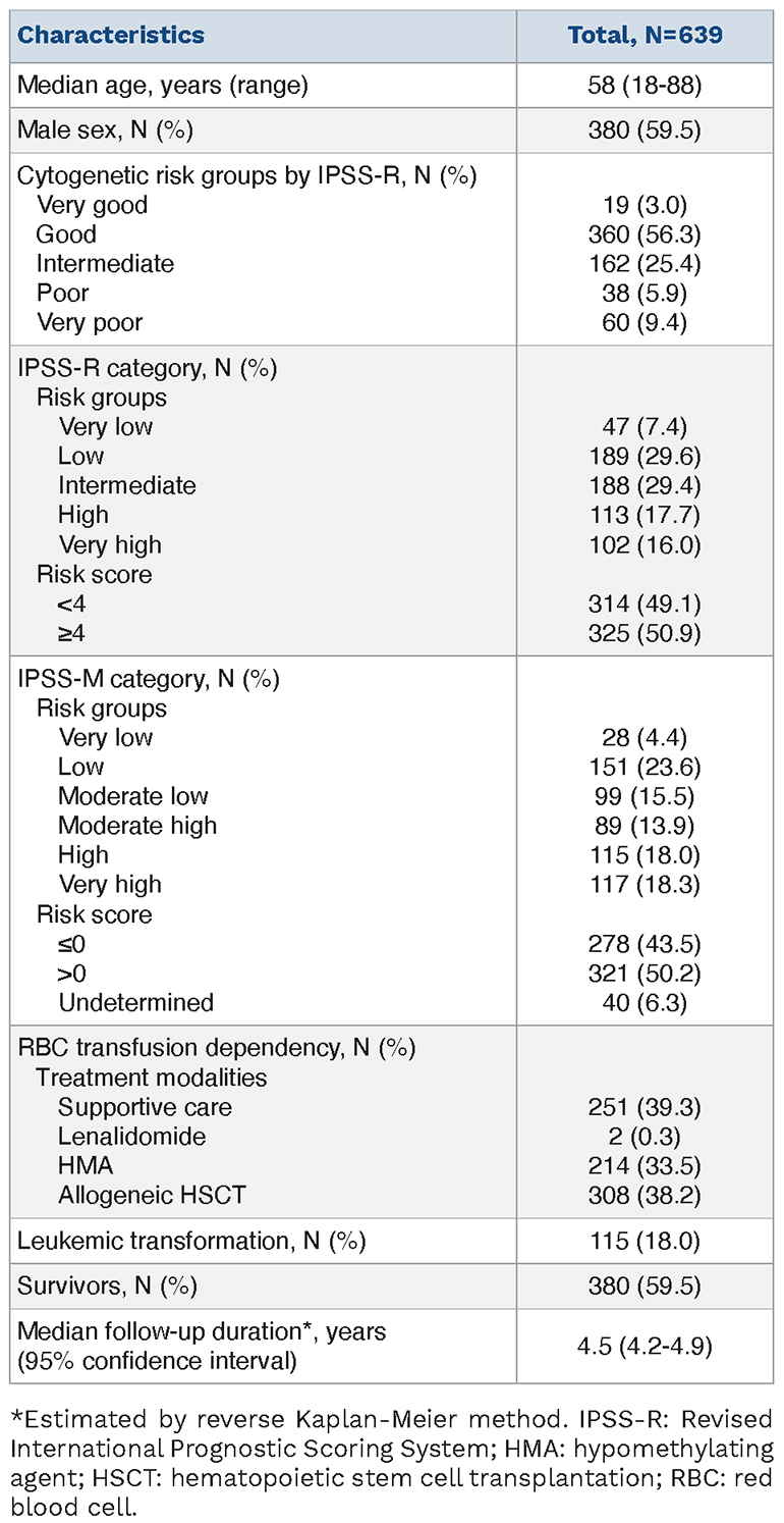 The study included 639 adult MDS patients per WHO2016 criteria aged 18 years or older who were treated at Seoul St. Mary’s Hospital, a national tertiary referral and transplant center, between 2007 and 2022. Patients were enrolled if they had available next-generation sequencing (NGS) data from untreated samples and complete clinical, pathologic, and cytogenetic information. The Institutional Review Board of the Catholic Medical Center approved this study (KC18TESE0700). The analyses were conducted in accordance with the guidelines of the Institutional Review Board and followed the ethical principles outlined in the Declaration of Helsinki. The diagnosis was independently re-reviewed by five experienced hematopathologists and reclassified into new classifications considering additional genetic information. The baseline characteristics of the patients are summarized in Table 1. The median age was 58 years (range, 18-88), and 380 (59.5%) were male. Patients with therapy-related MDS were included; this subgroup comprised 5.3% of the cohort. Disease-modifying therapy - including lenalidomide, hypomethylating agents, or allogeneic hematopoietic stem cell transplantation (HSCT) -was given to 388 patients (60.7%). Cytogenetic analysis was performed using conventional G-banding techniques, with abnormalities reported according to the 2024 International System for Human Cytogenetic Nomenclature.5 Fluorescence in situ hybridization assays targeted common recurrent alterations, including del(5q), del(20q), chromosome 7 abnormalities, MECOM rearrangement, and TP53 deletion. NGS used the St. Mary’s customized 87-gene myeloid panel, and variants were classified in accordance with the Association for Molecular Pathology guidelines and somatic oncogenicity criteria.6 Variants with at least 20 supporting reads and variant allele frequency (VAF) ≥5% were considered pathogenic; known driver hotspot mutations were included even if below this VAF threshold. All detected DDX41 mutations underwent germline confirmation via buccal DNA testing.7 Multiplex ligation-dependent probe amplification was used to identify KMT2A partial tandem duplications.