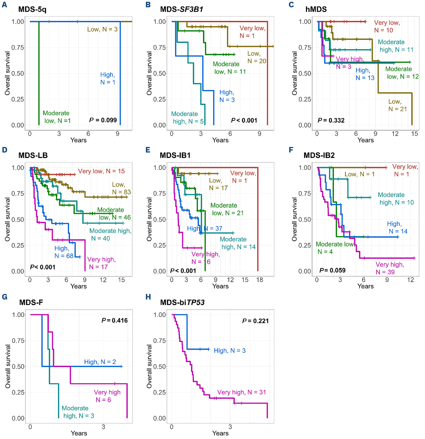 Figure 2.Overall survival according to IPSS-M within each WHO2022 category. (A-H) IPSS-M: Molecular International Prognostic Scoring System; MDS: myelodysplastic neoplasm; WHO: World Health Organization classification; MDS-5q: MDS with low blasts and 5q deletion; MDS-SF3B1: MDS with low blasts and SF3B1 mutation; MDS-biTP53: MDS with biallelic TP53 inactivation; MDS-LB: MDS with low blasts; hMDS: hypoplastic MDS; MDS-IB1: MDS with increased blasts-1; MDS-IB2: MDS with increased blasts-2; MDS-F: MDS with increased blasts and fibrosis.