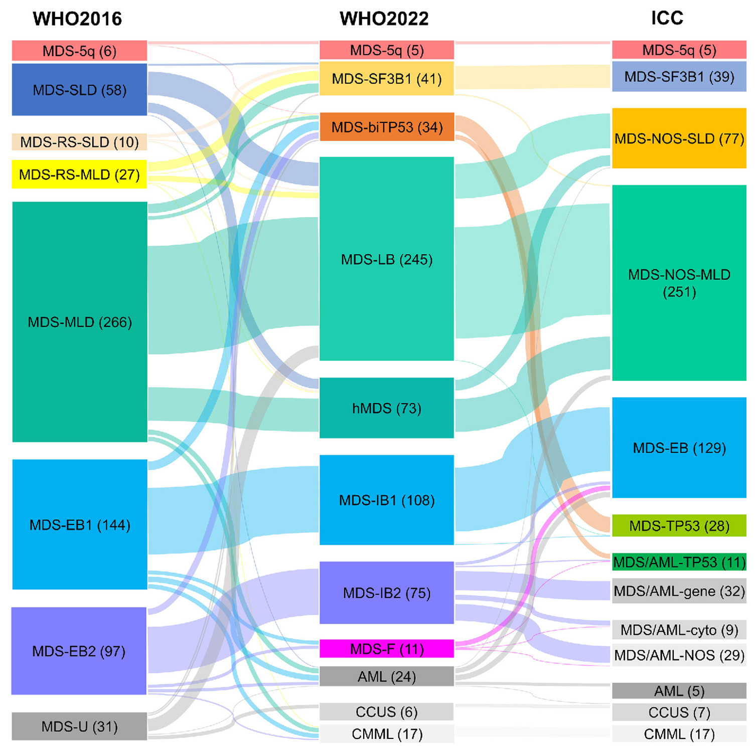 Figure 1.Redistribution of myelodysplastic syndromes patients according to WHO2016, WHO2022 and ICC classifications. MDS: myelodysplastic neoplasm; WHO: World Health Organization classification; ICC: International Consensus Classification; MDS-5q: MDS with low blasts and 5q deletion; MDS-SLD: MDS with single-lineage dysplasia; MDS-RS: MDS with ring sideroblasts; MDS-MLD: MDS with multilineage dysplasia; MDS-EB1: MDS with excess blasts-1; MDS-EB2: MDS with excess blasts-2; MDS-U: MDS unclassifiable; MDS-SF3B1: MDS with low blasts and SF3B1 mutation; MDS-biTP53: MDS with biallelic TP53 inactivation; MDS-LB: MDS with low blasts; hMDS: hypoplastic MDS; MDS-IB1: MDS with increased blasts-1; MDS-IB2: MDS with increased blasts-2; MDS-F: MDS with increased blasts and fibrosis; AML: acute myeloid leukemia; CCUS: clonal cytopenia of undetermined significance; CMML: chronic myelomonocytic leukemia; NOS: not otherwise specified: MDS-TP53: MDS with mutated TP53; MDS/AML-gene: MDS/AML with myelodysplasia-related gene mutations; MDS/AML-cyto: MDS/AML with myelodysplasia-related cytogenetic abnormalities.