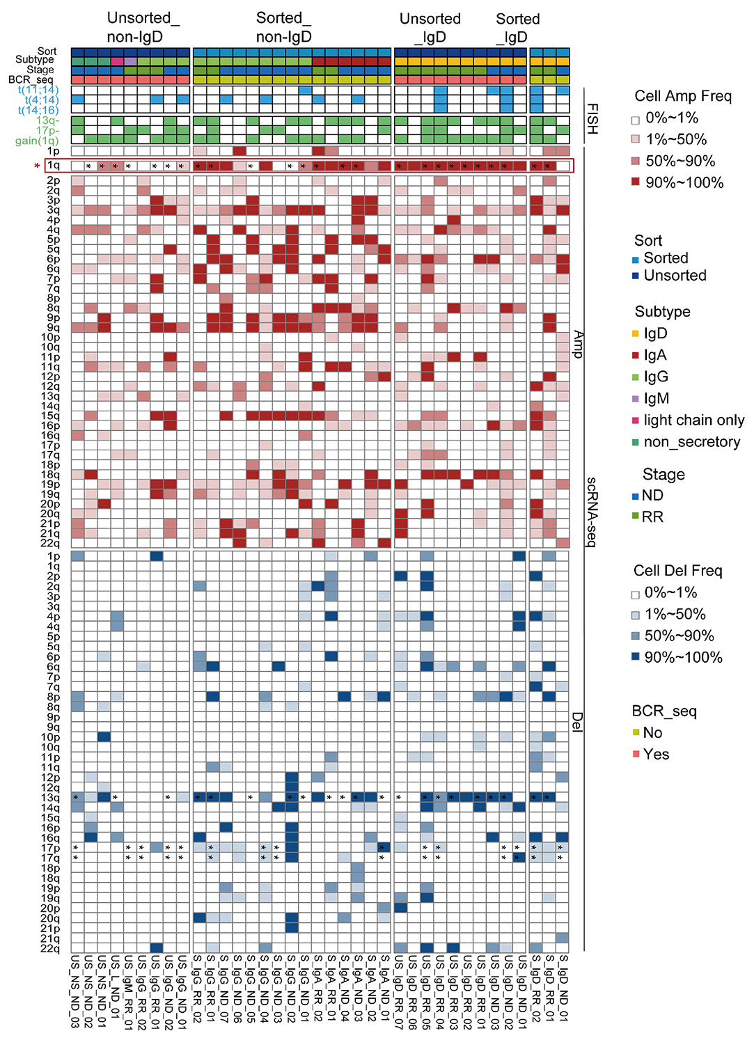 Figure 2.Copy number variants of all samples. Copy number variants of all samples inferred by inferCNV. On the left, a summary of key information for all multiple myeloma samples, including cytogenetic abnormalities detected by fluorescence in situ hybridization (FISH). On the right, copy number variants of all samples are depicted. An asterisk denotes cytogenetic abnormalities detected by FISH. AMP: amplification; Del: deletion; scRNA-seq: single-cell RNA sequencing; Amp Freq: amplification frequency; ND: newly diagnosed; RR: relapsed/refractory; Del Freq: deletion frequency; BCR_seq: B-cell receptor sequencing.