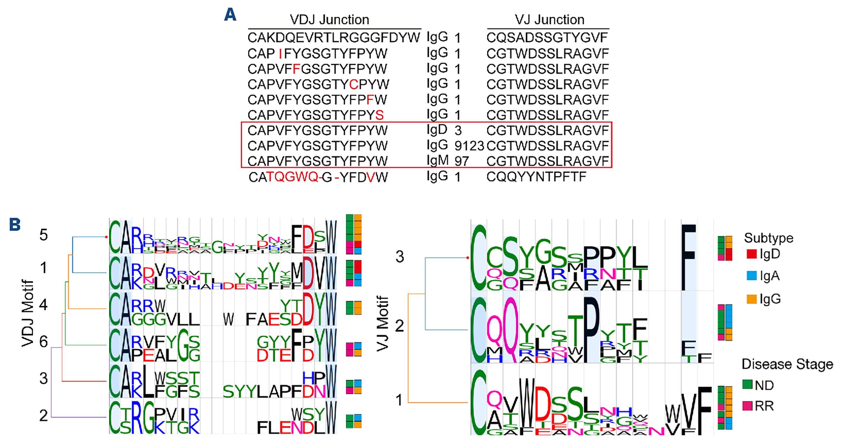 Figure 1.Analysis of B-cell receptor profiles across 18 multiple myeloma samples. (A) Comparison of different classes of myeloma malignant cells from patient S_IgG_RR_02, highlighting VDJ and VJ sequences with differing amino acids marked in red. Clones sharing the same VDJ and VJ but with different heavy chain C domains are boxed, offering insights into clonal evolution and diversity within individual patients. (B) Motif analysis of VDJ and VJ sequences, with multiple myeloma (MM) subtypes, new diagnoses, and relapses annotated on the right with metadata, providing insights into the sequence motifs associated with different MM subtypes and disease stages. ND: newly diagnosed; RR: relapsed/refractory.