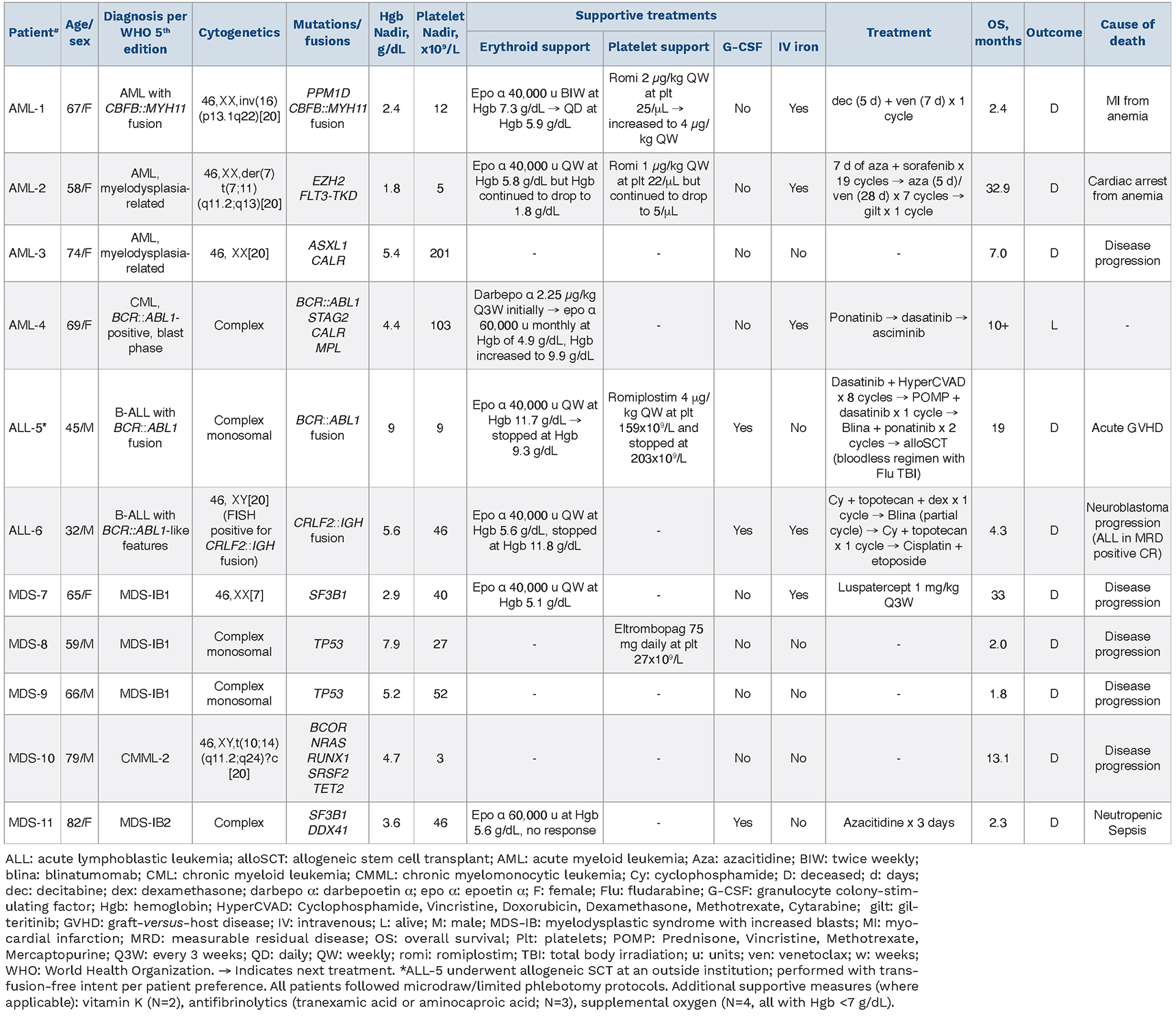 We identified 13 patients meeting inclusion criteria; two patients accepted blood transfusion and were excluded from this report. Our series (median age of 66.5 years, 54.5% female) consisted of four patients with AML, four with MDS with increased blasts (MDS-IB1/IB2), one patient with chronic myelomonocytic leukemia (CMML-2), and two with ALL. Among the AML patients, there was one core-binding factor AML, two myelodysplasia-related changes, and one chronic myeloid leukemia in blast phase (CML-BP). Of the two ALL patients, one had Philadelphia-like B-ALL and one had Philadelphia-positive ALL. At diagnosis, baseline hemoglobin (Hgb) levels ranged from 5.2 g/L to 11.9 g/dL, and platelet counts ranged from 27x109/L to 248x109/L. The median follow-up duration was 5.7 months (range, 1-33 months), and the median overall survival (OS) was 5.7 months. All patients survived at least 4 weeks post-diagnosis.