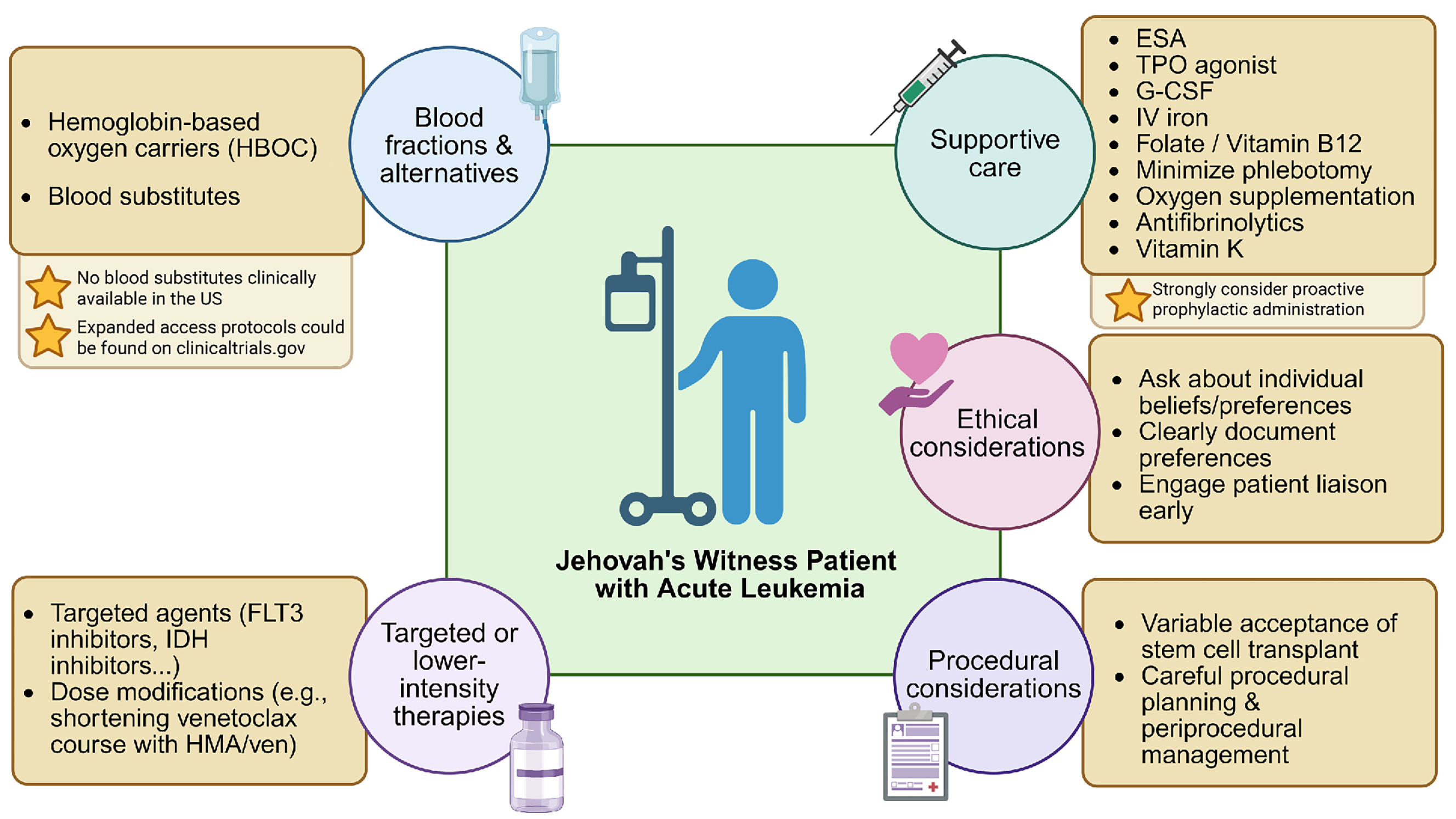Our case series highlights the importance of (i) individualizing leukemia-directed care, (ii) introducing blood substitutes, hemoglobin-based oxygen carriers, or agents that safely promote hematopoiesis without stimulating leukemogenesis, and (iii) proactively providing prophylactic thrombopoietic and erythropoietic support with myelosuppressive therapies (Figure 1). While strategies such as ESA, TPO-RA, intravenous iron, and antifibrinolytics can sometimes stabilize cytopenias and facilitate therapy, the overall prognosis of JW patients with acute leukemia and high-grade myeloid neoplasms remains poor, particularly in AML. Importantly, our series documents two ALL patients who successfully received intensive chemotherapy without transfusion support, underscoring that such approaches are occasionally feasible with aggressive supportive care. For treating physicians, these cases highlight both the possibilities and the ethical dilemmas surrounding treatment decisions in patients who decline transfusions. Given the paucity of published data, our report adds practical insight into supportive measures and therapeutic outcomes that may help guide clinical decision-making in this challenging setting.