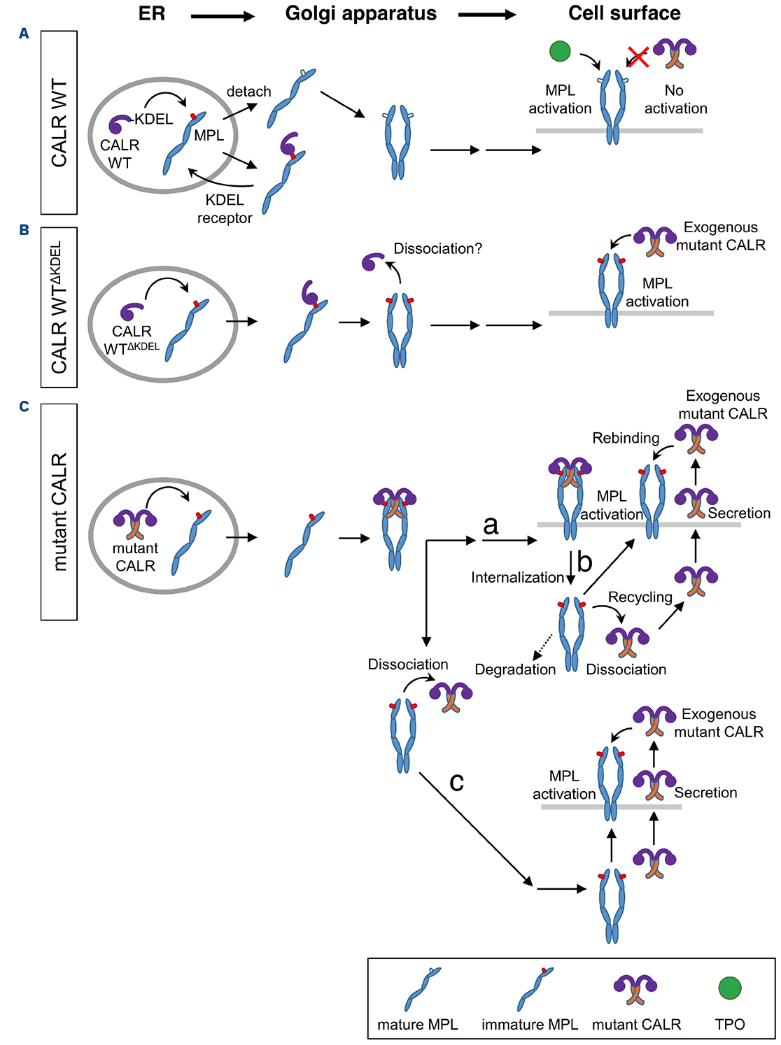 Figure 5.A model for the activation of MPL by mutant calretuculin. (A) In calreticulin (CALR) wild-type (WT)-expressing cells, CALR binds MPL with the endoplasmatic reticulum (ER) as a molecular chaperone. Following detachment from CALR, the N-glycans of MPL undergo modifications through a secretory pathway and ultimately do not associate with mutant CALR on the cell surface. (B) In cells expressing CALR WTΔKDEL, CALR WTΔKDEL binds the immature N-glycans of MPL in the ER and subsequently transports immature MPL from the ER. Immature MPL localized on the cell surface can be activated by exogenously added mutant CALR protein. (C) Three plausible mechanisms by which mutant CALR activates immature MPL. In in subpanel (a), mutant CALR remains associated with immature MPL and is co-transported to the cell surface, where it facilitates MPL activation. In subpanel (b), mutant CALR binds to immature MPL in the ER and escorts it to the cell surface, where MPL is activated in a thrombopoietin (TPO)-independent manner. Following MPL internalization, mutant CALR dissociates from MPL and is secreted into the extracellular space. The internalized immature MPL is recycled back to the cell surface, where it can rebind secreted mutant CALR, resulting in sustained MPL activation. In subpanel (C), mutant CALR dissociates from immature MPL before reaching the cell surface, is secreted into the extracellular space, and subsequently rebinds to immature MPL at the cell surface, thereby inducing its activation.