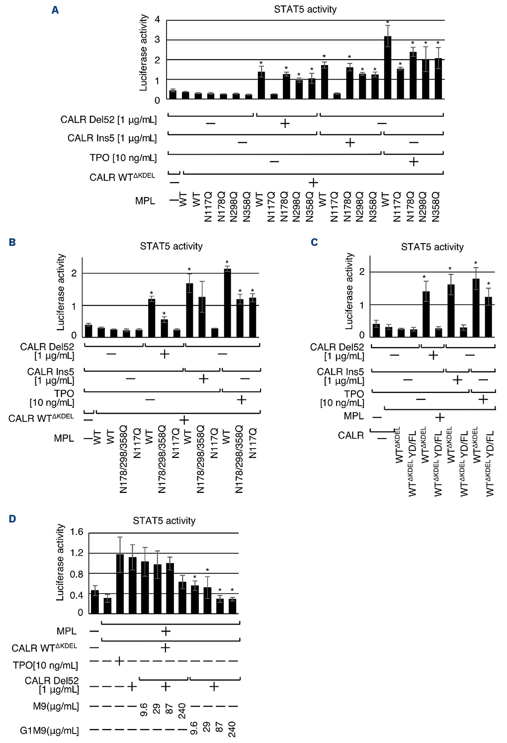 Figure 4.The extracellular mutant calretuculin protein requires immatureN-type glycans of MPL for MPL activation in calretuculin WTΔKDEL-expressing cells. (A) A comparison of STAT5 transcriptional activity by mutant calreticulin (CALR) when a mutation is introduced into 1 of the 4 N-type glycosylation modification sites (N117Q, N178Q, N298Q, and N358Q) of MPL. Data are shown as the mean ± standard deviation (SD) of 3 replicates. The experiment was independently performed 3 times with consistent results, and representative data are presented. Statistical significance was assessed between each treatment group (mutant CALR or thrombopoietin [TPO]) and the untreated control (-) within each condition. *P<0.05. (B) A comparison of the STAT5 transcriptional activity of mutant CALR when a mutation is introduced into N117 of MPL (N117Q) or when mutations are introduced into 3 sites (N178/298/358Q). Data are presented as the mean ± SD of 3 replicates. The experiment was independently repeated 3 times with similar outcomes, and representative data are shown. Statistical significance was determined between each treatment group (mutant CALR or TPO) and the untreated control (-). *P<0.05. (C) A comparison of STAT5 transcriptional activity by mutant CALR when a mutation is introduced into the carbohydrate recognition site of CALR WTΔKDEL (WTΔKDEL YD/FL). Data are shown as the mean ± SD of 3 replicates. The experiment was independently conducted twice with reproducible results, and representative data are shown. Statistical comparison was performed between each treatment group (mutant CALR or TPO) and the untreated control (-) within each experimental condition. *P<0.05. (D) STAT5 transcriptional activity is shown when N-glycans (M9 or G1M9) are added with recombinant mutant CALR to cells expressing MPL and CALR WTΔKDEL. STAT5 transcriptional activity was investigated by adding recombinant mutant CALR proteins to HEK293T cells. Data are shown as the mean ± SD of 3 replicates and are representative of 3 independent experiments. Statistical significance was evaluated between each treatment group (CALR Del52 plus M9 or G1M9) and the untreated control (CALR Del52 alone). *P<0.05. WT: wild-type.