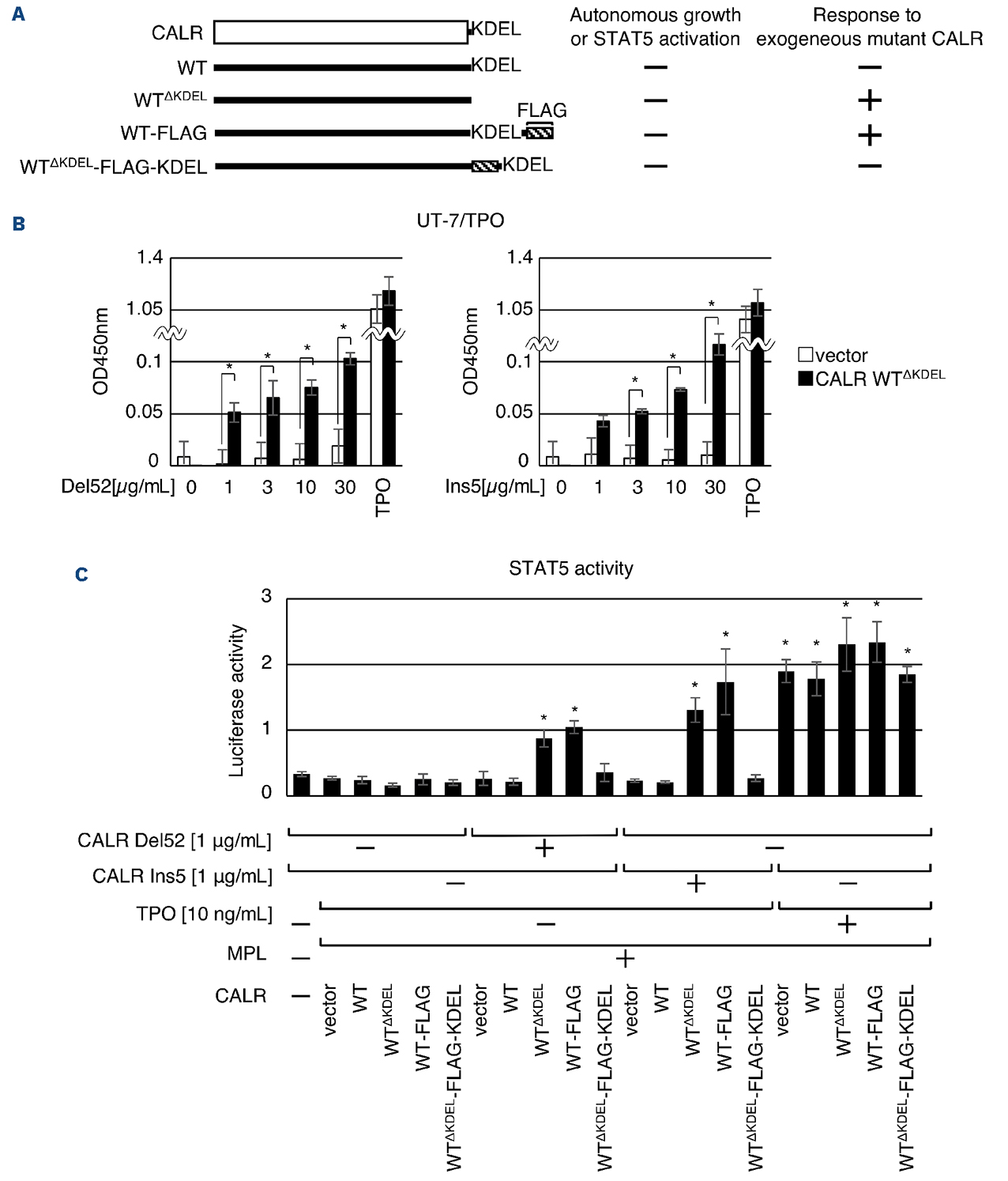 Figure 3.The removal of the KDEL sequence from wild-type CALR calreticulin in the activation of MPL in response to extracellular mutant calretuculin. (A) A schematic representation of calreticulin (CALR) derivatives characterized in the subsequent analysis. (B) Cell proliferation assay in the absence or presence of the indicated amounts of recombinant mutant CALR for UT-7/ thrombopoietin (TPO) vector (open bar) and CALR WTΔKDEL (solid bar) cells. Absorbance was measured at 450 nm to detect the formazan dye produced by viable cells after 3 days. Data are presented as the mean ± standard deviation (SD) of 3 replicates. The experiment was independently repeated 3 times with similar results, and representative data are shown. *P<0.05. (C) STAT5 transcriptional activity assessed by the luciferase reporter assay. HEK293T cells expressing wild-type (WT) CALR derivatives and MPL were used. Data are represented as the mean ± SD of 3 replicates. Statistical significance was made between each treatment groups (mutant CALR or TPO) and the untreated control (-) within each experimental condition. *P<0.05.