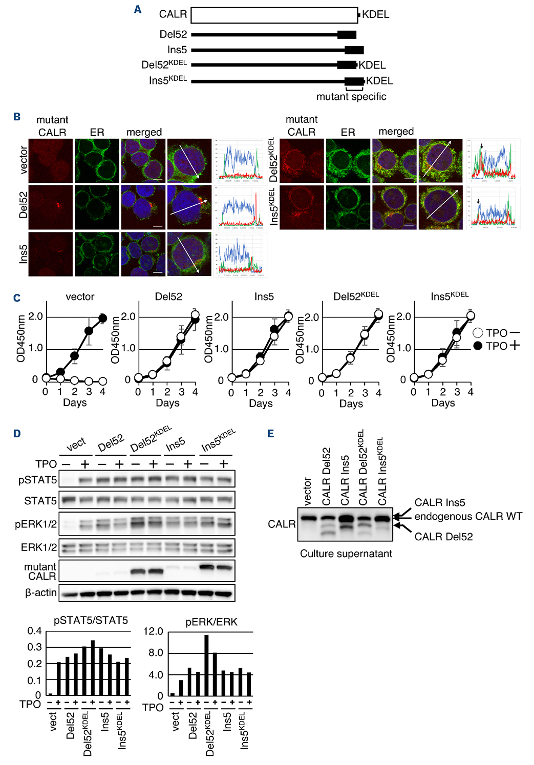 Figure 1.The attachment of the KDEL sequence to the C-terminus does not modulate the oncogenic property of mutant calretuculin. (A) A schematic representation of calreticulin (CALR) derivatives characterized in the subsequent analysis. (B) Confocal fluorescence images of UT-7/ thrombopoietin (TPO) vector, CALR Del52, CALR Ins5, CALR Del52KDEL, and CALR Ins5KDEL cells after the immunofluorescence labeling of mutant CALR, Calnexin (endoplasmatic reticulum [ER]) and nuclei. Scale bar: 10 µm. The intensity profiles of each fluorescent signal in the merged images (indicated by white arrows) are shown as line graphs using the corresponding colors. Black arrows indicate regions of co-localization between mutant CALR and calnexin signals. (C) Cell proliferation assay in the absence (open circle) or presence (closed circle) of 10 ng/mL TPO for UT-7/TPO vector, CALR Del52, CALR Ins5, CALR Del52KDEL, and CALR Ins5KDEL cells. Absorbance was measured at 450 nm to detect the formazan dye produced by viable cells. The mean value and standard deviation (SD) of 3 replicates are shown. (D) Immunoblot analysis of extracts prepared from UT-7/TPO vector, CALR Del52, CALR Ins5, CALR Del52KDEL, and CALR Ins5KDEL cells cultured in the presence or absence of 10 ng/mL TPO. The y-axis represents the ratio of phosphorylated STAT5 to total STAT5 (bottom, left graph), and phosphorylated ERK to total ERK (bottom, right graph), respectively. The experiment was repeated on 3 separate occasions. (E) Immunoblot analysis of secreted mutant CALR in the culture supernatant of UT-7/TPO vector, CALR Del52, CALR Ins5, CALR Del52KDEL, and CALR Ins5KDEL cells.
