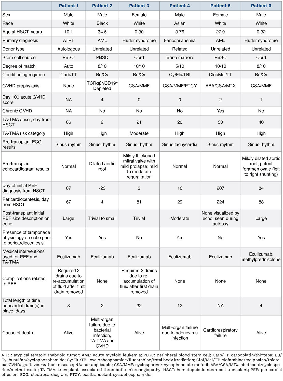 - Tinianow A, Gay JC, Bearl DW, Connelly JA, Godown J, Kitko CL. Pericardial effusion following hematopoietic stem cell transplantation in children: incidence, risk factors, and outcomes. Pediatr Transplant. 2020; 24(5):e13748. Google Scholar