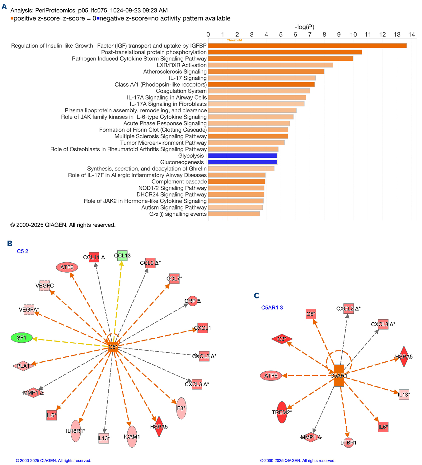 Figure 2.Pathway enrichment and upstream regulator analysis of differentially expressed proteins in pericardial fluid from hematopoietic stem cell transplant recipients with pericardial effusions. (A) Top enriched canonical pathways identified by Ingenuity Pathway Analysis from 785 proteins with P≤0.05 and absolute log₂ fold change ≥0.75. Pathways are ranked by -log(P value), and activity is predicted by z-score (orange: activated, blue: inhibited). The most significantly enriched pathway was “Regulation of insulin-like growth factor transport and uptake by insulin-like growth factor binding proteins,” followed by several inflammation-related pathways including interleukin (IL)-17 signaling, cytokine storm signaling, acute phase response, and complement cascade. (B, C) Predicted upstream regulator networks derived from Qiagen Ingenuity Pathway Analysis. Complement factors and cytokines were identified as leading upstream regulators, including C5, C5AR1, IL6, and IL-17RA. Network visualizations show predicted regulatory relationships and directionality of protein expression changes. These findings suggest a central role for complement and IL-17 pathways in the pathogenesis of pericardial effusions following hematopoietic stem cell transplant.