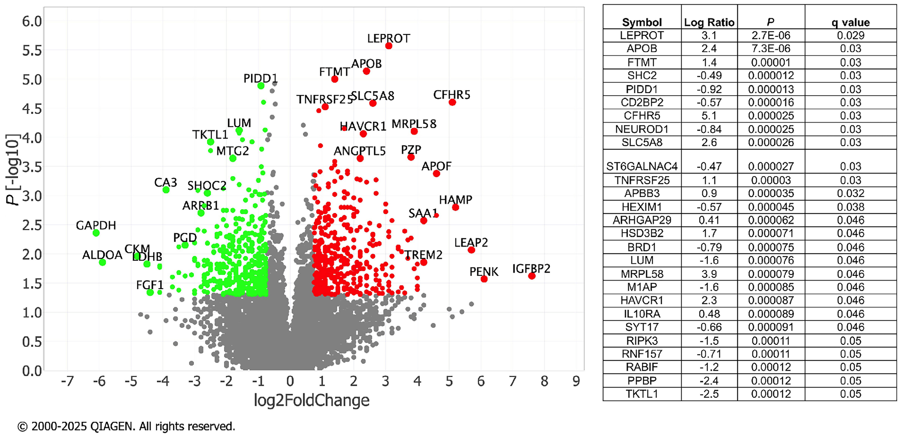 Figure 1.Volcano plot of differentially expressed proteins in pericardial fluid from hematopoietic stem cell transplant recipients with pericardial effusions. This volcano plot displays the log₂ fold change (x-axis) versus -log₁₀ P value (y-axis) for all proteins analyzed. A total of 1,271 proteins were differentially expressed with P≤0.05. Red and green dots indicate significantly upregulated and downregulated proteins, respectively. Several proteins demonstrated marked differential expression highlighting potential mechanistic pathways. A subset of 27 differentially expressed proteins met stricter criteria with adjusted P values ≤0.05.