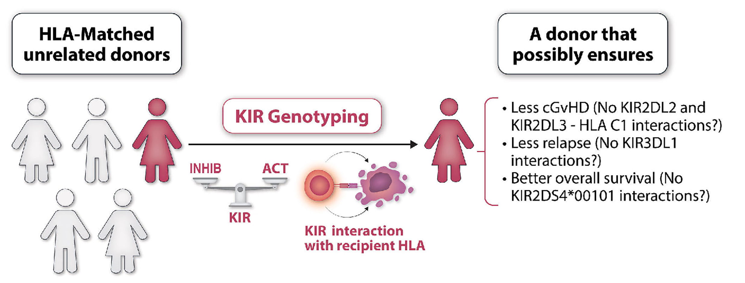 Figure 1.A schematic representation of suggested unrelated donor selection through KIR genotyping. KIR genotyping of HLA-matched unrelated donors informs about inhibitory and activatory KIR that can interact with recipient HLA molecules. Specific KIR/HLA interactions might help to assess the probability of some transplant outcomes such as chronic graft-versus-host disease and overall survival. This information could help to improve unrelated donor selection. HLA: human leukocyte antigen; KIR: killer cell immunoglobulin-like receptors; INHIB: inhibitory; ACT: activatory; cGvHD: chronic graft-versus-host disease.