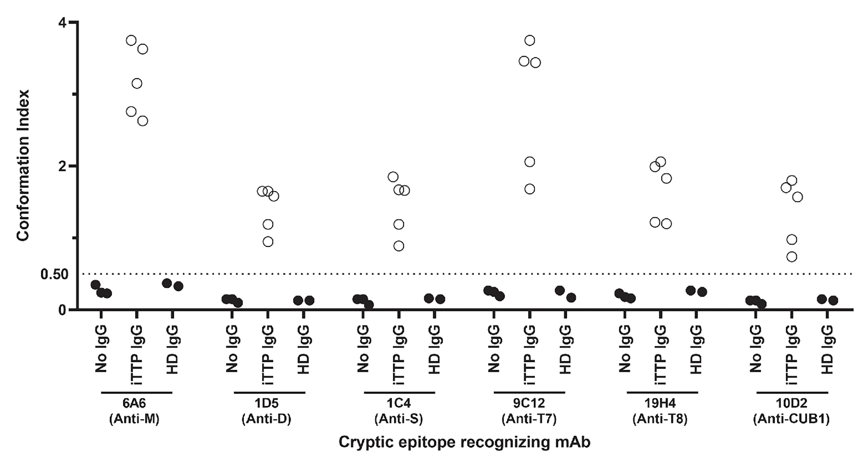 Figure 5.Pathogenic IgG trigger distinct open ADAMTS13. Microtiter plates were coated with monoclonal antibodies (mAb) to screen for cryptic ADAMTS13 epitope exposure in plasma from healthy donors in the absence or presence of the total immunoglobulin G (IgG) fraction purified from patients with acute immune-mediated thrombotic thrombocytopenic purpura (iTTP) or healthy donors (HD). In the absence of IgG, plasma ADAMTS13 was verified to be closed (closed circles). Following incubation of the total IgG fraction purified from HD, closed ADAMTS13 was indicated by inaccessible cryptic epitopes. Incubation with iTTP-purified IgG induced distinct open ADAMTS13 in which all epitopes became accessible (open circles). The dotted line represents the cut-off that differentiates accessible (>0.50) from inaccessible (≤0.50) ADAMTS13 epitopes.