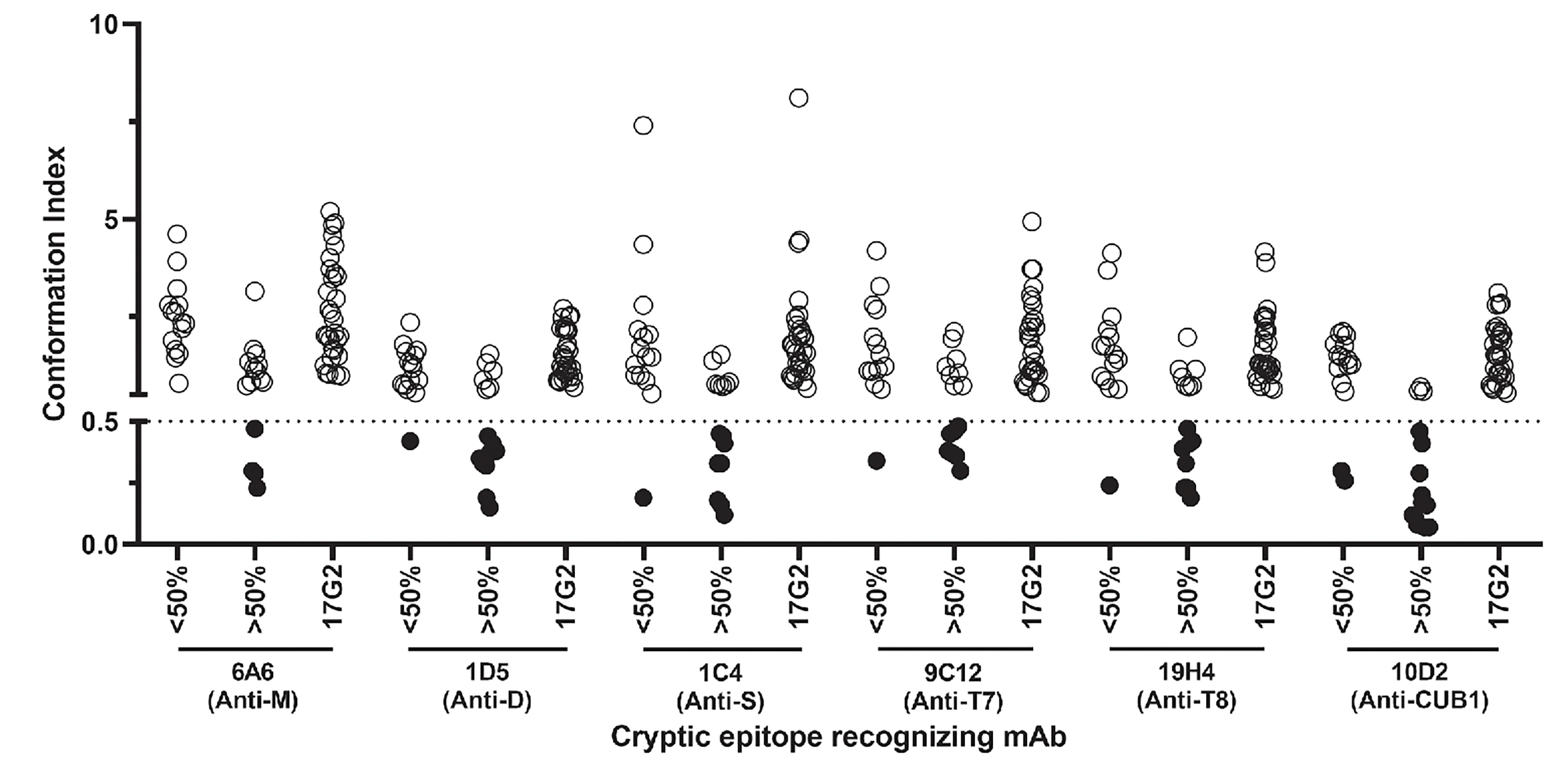 After identifying this new set of cryptic epitope-recognizing mAb, we screened a cohort of 25 healthy donors to verify the CI cut-off that distinguishes between open ADAMTS13 with accessible epitopes or closed ADAMTS13 with cryptic epitopes. Previously, we identified a CI cut-off of 0.50 in our Open/Closed ELISA to evaluate the accessibility of the cryptic epitope recognized by the anti-S mAb 1C4.9 ,10 Values above this threshold indicated open ADAMTS13 with accessible 1C4 epitope, while those equal or below the CI cut-off indicated closed ADAMTS13 with a cryptic 1C4 epitope. Similarly, we found that this same CI cut-off of 0.50 can be used to determine whether the cryptic epitopes recognized by mAb 6A6, 1D5, 9C12, 19H4 and 10D2 are accessible (>0.50) or cryptic (≤0.50). Indeed, the CI values for closed ADAMTS13 (absence of 17G2) were below 0.50 in 22 out of 25 plasma samples from healthy donors (range CI6A6=0.06-0.35, range CI1D5=0.05-0.46, range CI9C12=0.04-0.38, range CI19H4=0.07-0.35 and range CI10D2=0.02-0.15), whereas those for open ADAMTS13 (presence of 17G2) were all above 0.50 (range CI6A6=0.83–2.03, range CI1D5=0.66–1.54, range CI9C12=0.58–1.33, range CI19H4=0.67–1.79 and range CI10D2=0.58–1.39) (Figure 2). Of note, three healthy donors had a CI6A6, and CI9C12 above 0.50 indicating that both M and T7 epitopes were accessible in these three healthy donors while the 1D5, 1C4, 19H4 and 10D2 epitopes within the D, S, T8 and CUB1 domains remained cryptic.