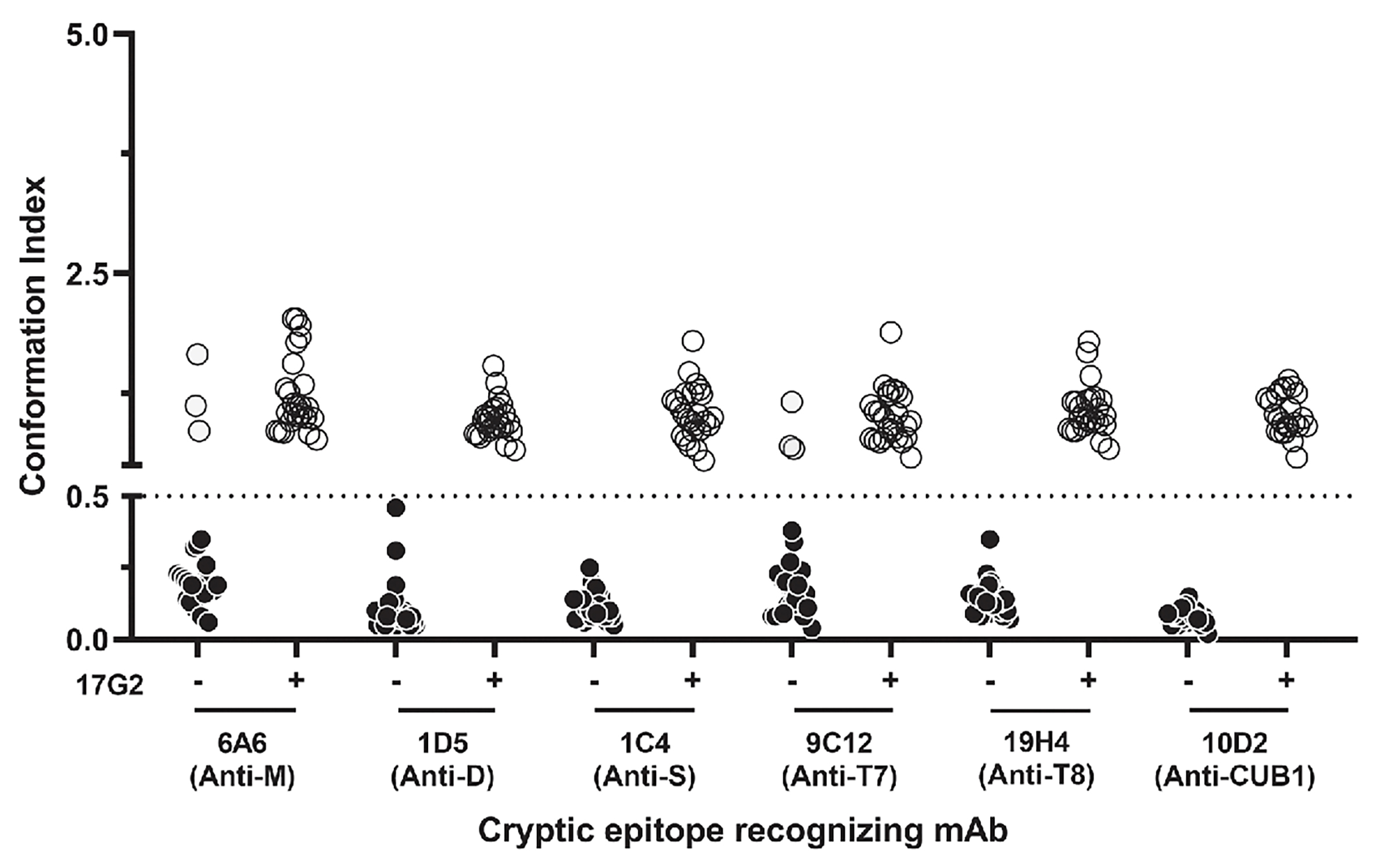 Previously, we showed that patients with acute phase iTTP presented open ADAMTS13 with an accessible 1C4 S domain epitope. Using our novel cryptic epitope-recognizing mAb, we then wanted to evaluate whether acute phase iTTP patients present one distinct or multiple variable open ADAMTS13 conformations. We, therefore, screened the accessibility of each of the novel cryptic epitopes in plasma from 53 acute phase iTTP patients. For 14 patients, CI values could not be calculated as ADAMTS13 antigen was undetectable (i.e. ≤0.03 μg/mL).10,20 Interestingly, for all other acute phase iTTP patients, we found that all cryptic epitopes in the M, D, S, T7, T8 and CUB1 domains were uniformly exposed, regardless of the presence of 17G2 (Figure 3). Indeed, all acute iTTP patients presented CI values above 0.50 (range CI6A6=0.91-18.27, range CI1D5=0.58-9.47, range CI9C12=0.63-25.50, range CI19H4=2.50-14.59, range CI10D2=0.51-9.42). As expected, the conformation remained open in all iTTP samples when preincubated in the presence of 17G2 (range CI6A6=1.33-16.74, range CI1D5=0.73-9.52, range CI9C12=0.58-20.58, range CI19H4=3.07-18.65, range CI10D2=0.62-9.39). Of note, one patient with acute phase iTTP had a cryptic CUB1 epitope in the presence of 17G2 (CI10D2=0.48). Overall, these results indicate that regardless of mAb 17G2 addition, acute phase iTTP patients consistently present one distinct open ADAMTS13 conformation in which all newly identified mAb epitopes are exposed.