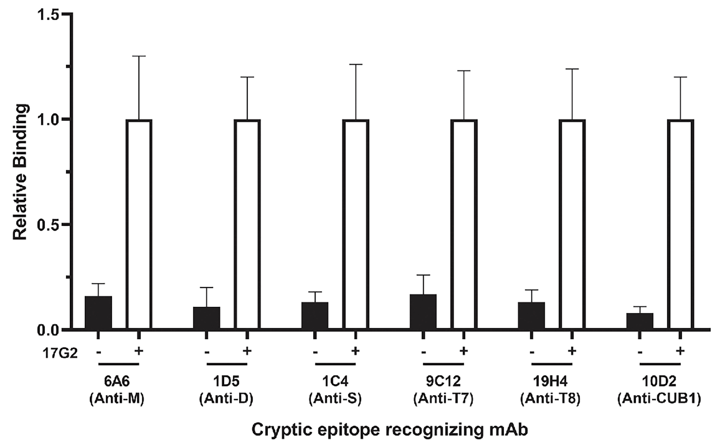 Figure 1.Open ADAMTS13 reveals cryptic epitopes across various domains. Closed plasma ADAMTS13 was incubated without (black bars) or with (white bars) the anti-CUB1 monoclonal antibody (mAb) 17G2, which conformationally opens ADAMTS13 before loading on a 96-well plate coated with the previously described mAb 1C4 and 6A6,9,14,1 6 and the new mAb 1D5, 9C12, 19H4 and 10D2, directed against epitopes in the S, M, D, T7, T8 and CUB1 domains, respectively. All coated mAb could capture open ADAMTS13 (white bars) but not closed ADAMTS13 (black bars), indicating that these mAb recognize cryptic epitopes that become exposed upon mAb 17G2-induced conformational opening of ADAMTS13. For each mAb, data are expressed as relative binding to open ADAMTS13 (mean ± standard deviation, N=3 independent experiments).