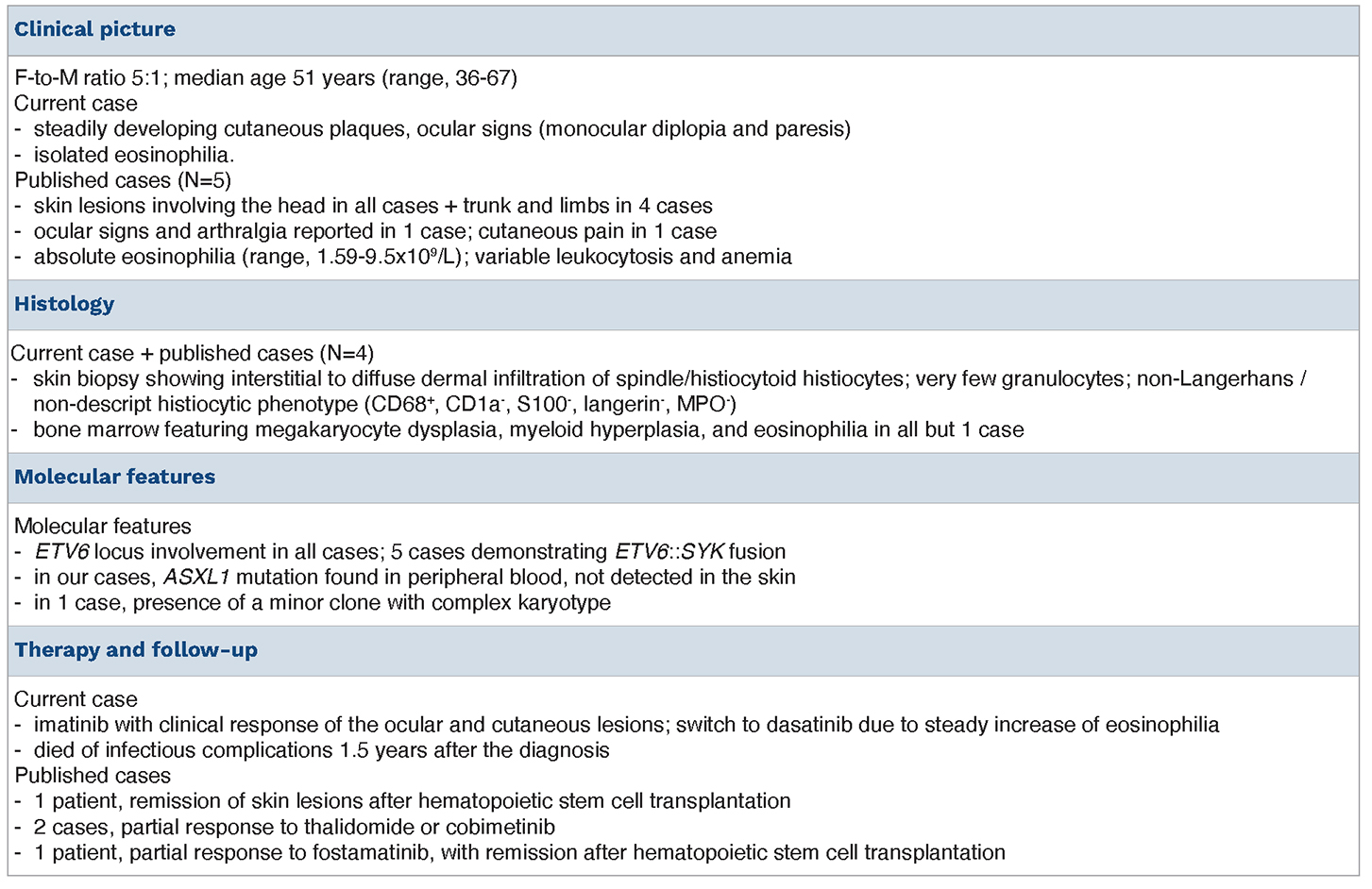 Table 1.Summary of major clinical and pathologic features of the collected cases of myeloid neoplasm, featuring eosinophilia and skin lesions and rearrangement of ETV6 locus at 12p13.